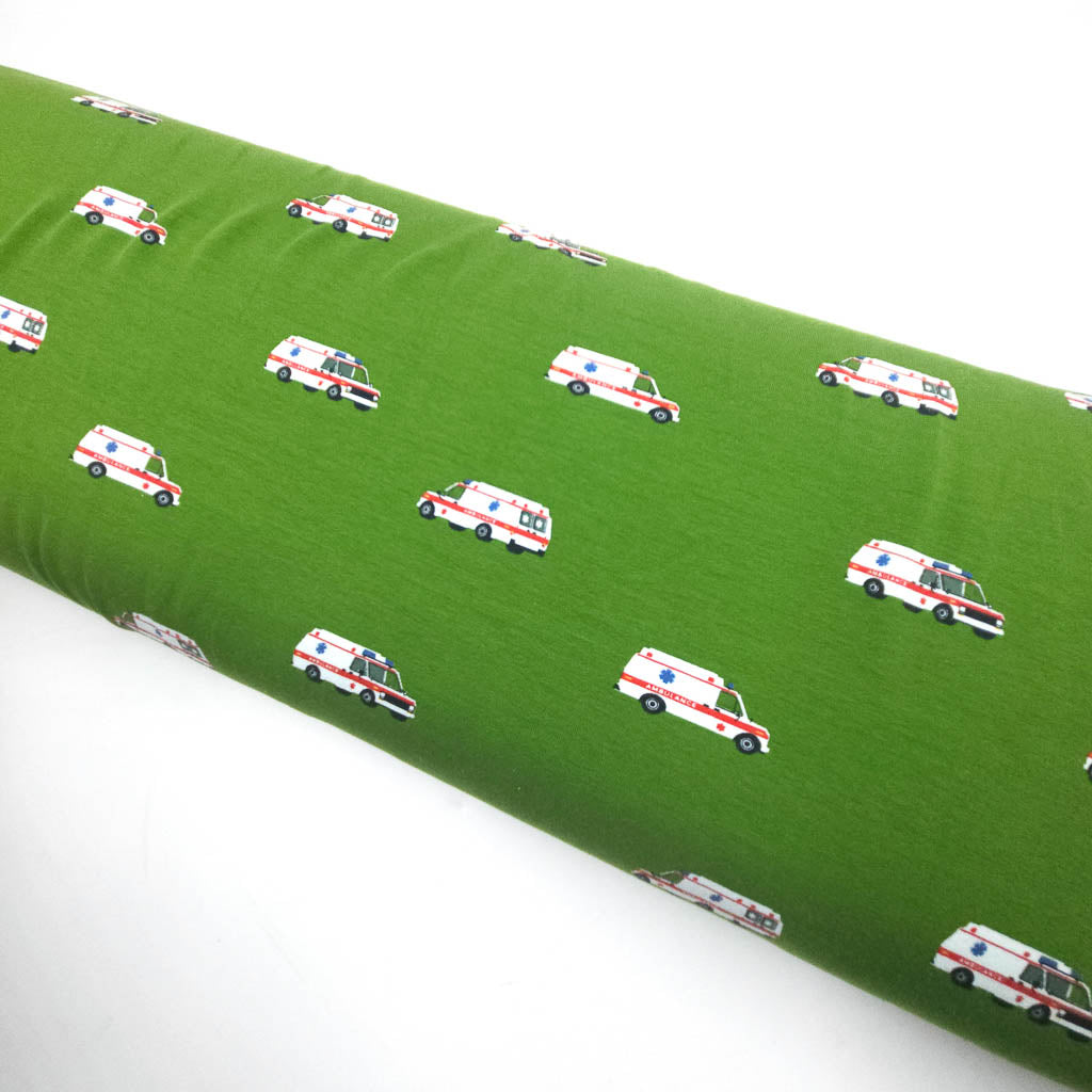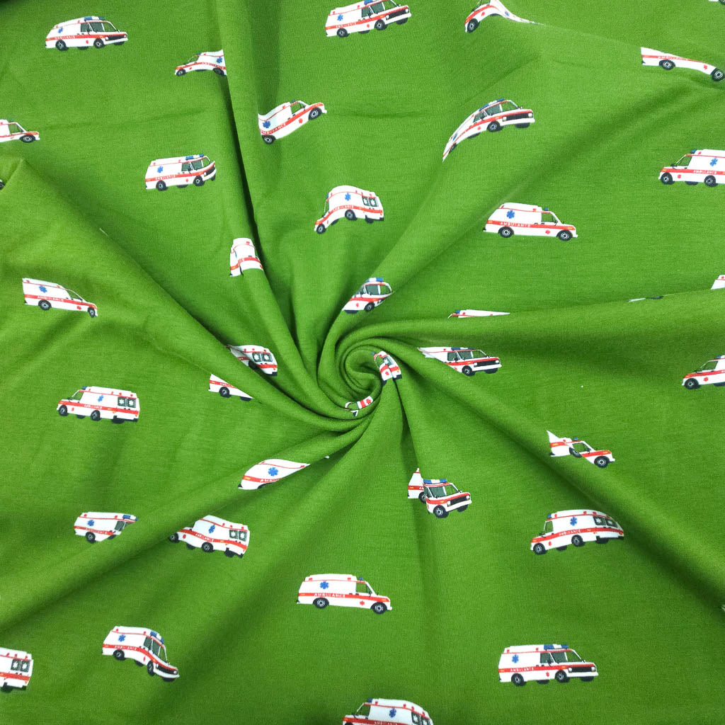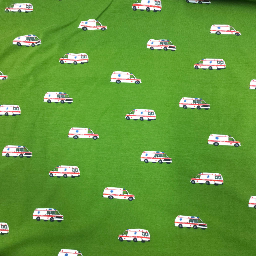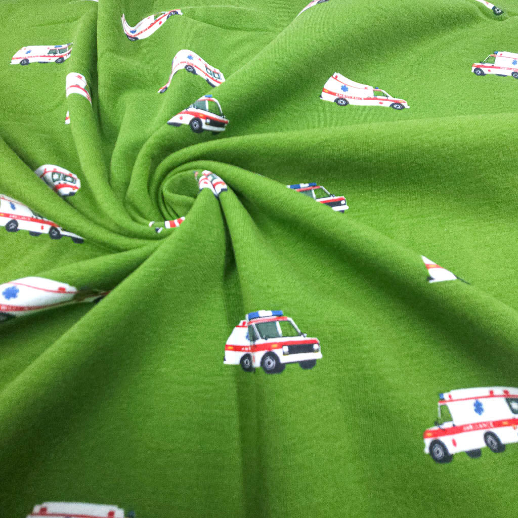 Baumwolljersey Ambulanz Grün: Hol dir diesen weichen Baumwolljersey – elastisch, anschmiegsam und perfekt für deine nächsten Projekte. Das lustige Rettungswagen auf frischem Grün Design macht richtig Lust aufs Nähen. Der Stoff ist Oeko‑Tex Standard 100 zertifiziert – gut zur Haut und zur Umwelt. ✂️🧵