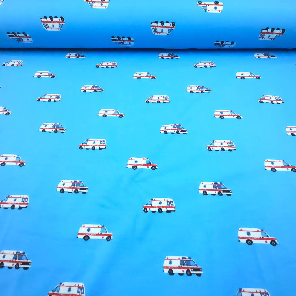 Baumwolljersey Ambulanz Hellblau: Hol dir diesen weichen Baumwolljersey – elastisch, anschmiegsam und perfekt für deine nächsten Projekte. Das Rettungswagen auf sanftem Hellblau Design macht richtig Lust aufs Nähen. Der Stoff ist Oeko‑Tex Standard 100 zertifiziert – gut zur Haut und zur Umwelt. ✂️🧵