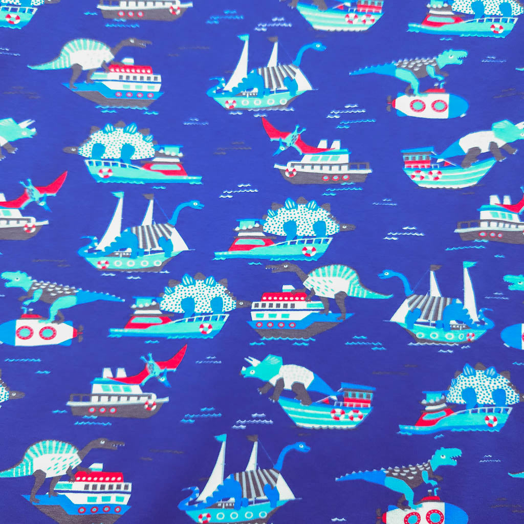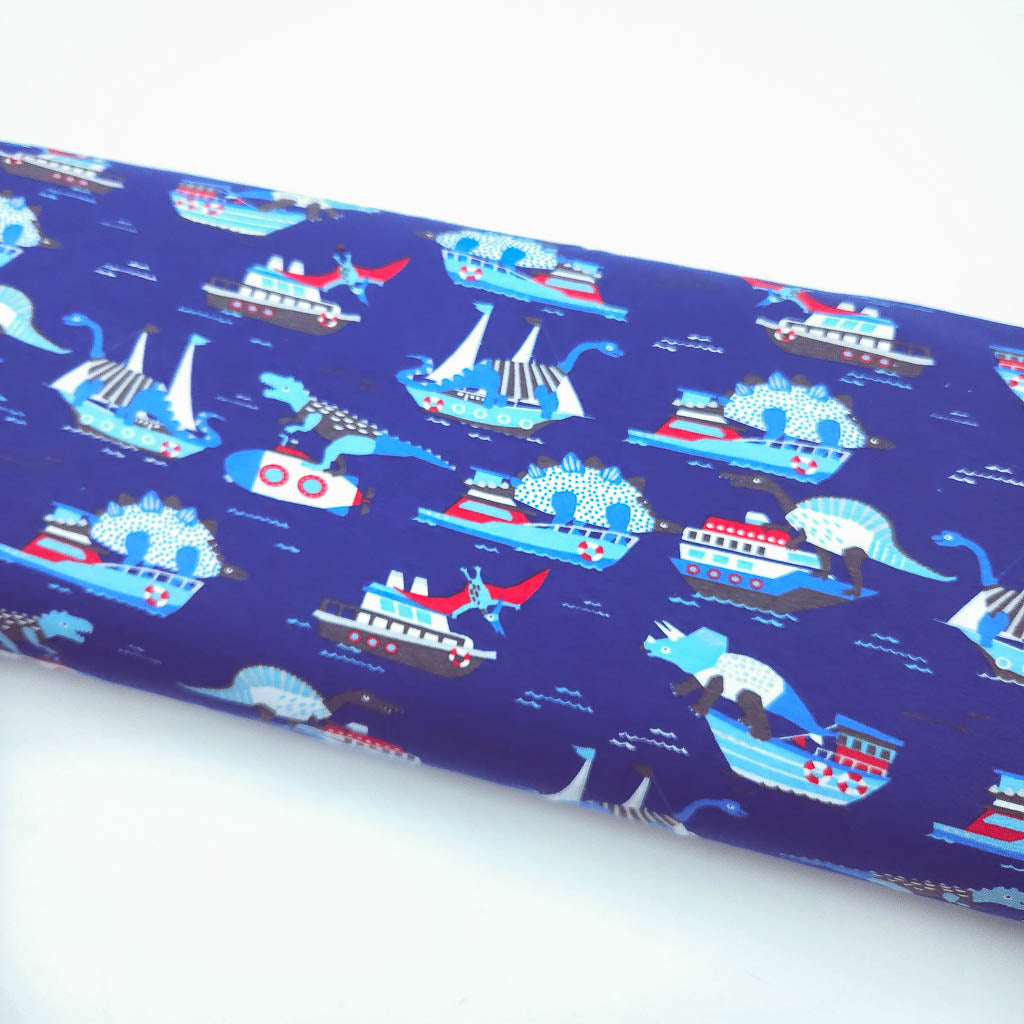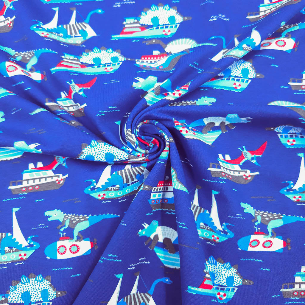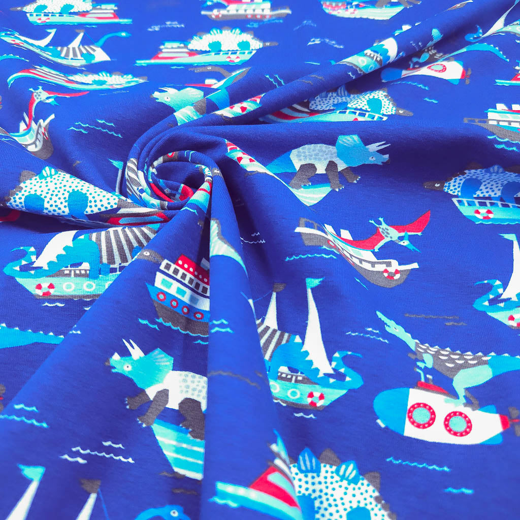 Baumwolljersey Dino‑Boote Königsblau: Hol dir diesen weichen Baumwolljersey – elastisch, anschmiegsam und perfekt für deine nächsten Projekte. Das maritime Dino‑Boote in kräftigem Königsblau Design macht richtig Lust aufs Nähen. Der Stoff ist Oeko‑Tex Standard 100 zertifiziert – gut zur Haut und zur Umwelt. ✂️🧵