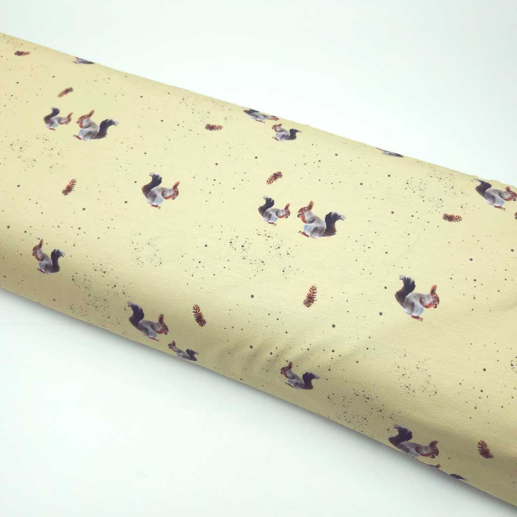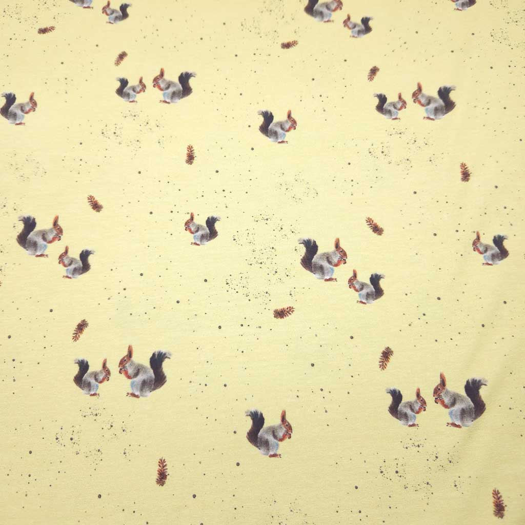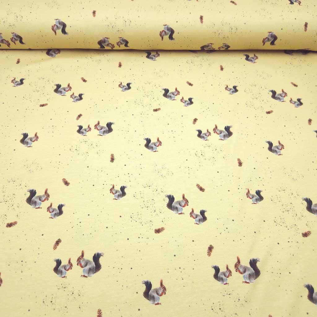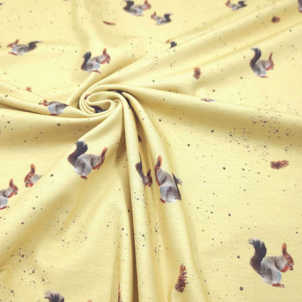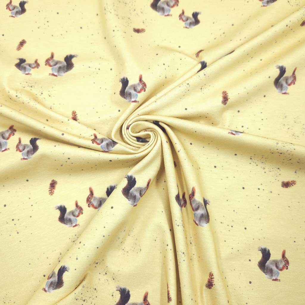 Baumwolljersey Eichhörnchen – Gelb – weich, elastisch und hautfreundlich. Der Stoff ist Oeko‑Tex zertifiziert und fühlt sich super angenehm an. Verspielt und sonnig: Auf warmem Gelb tummeln sich süße Eichhörnchen – perfekt für fröhliche Looks.