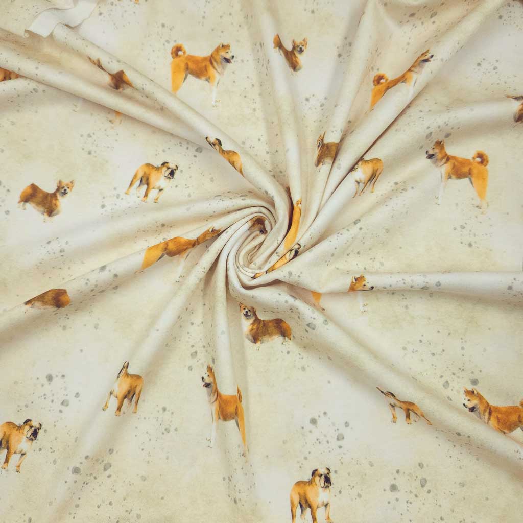 Baumwolljersey Hunde – Neutral – weich, elastisch und hautfreundlich. Der Stoff ist Oeko‑Tex zertifiziert und fühlt sich super angenehm an. Für alle Dog-Lovers: Der neutrale Jersey mit hübschen Hunden ist gemütlich, zeitlos und super süß.
