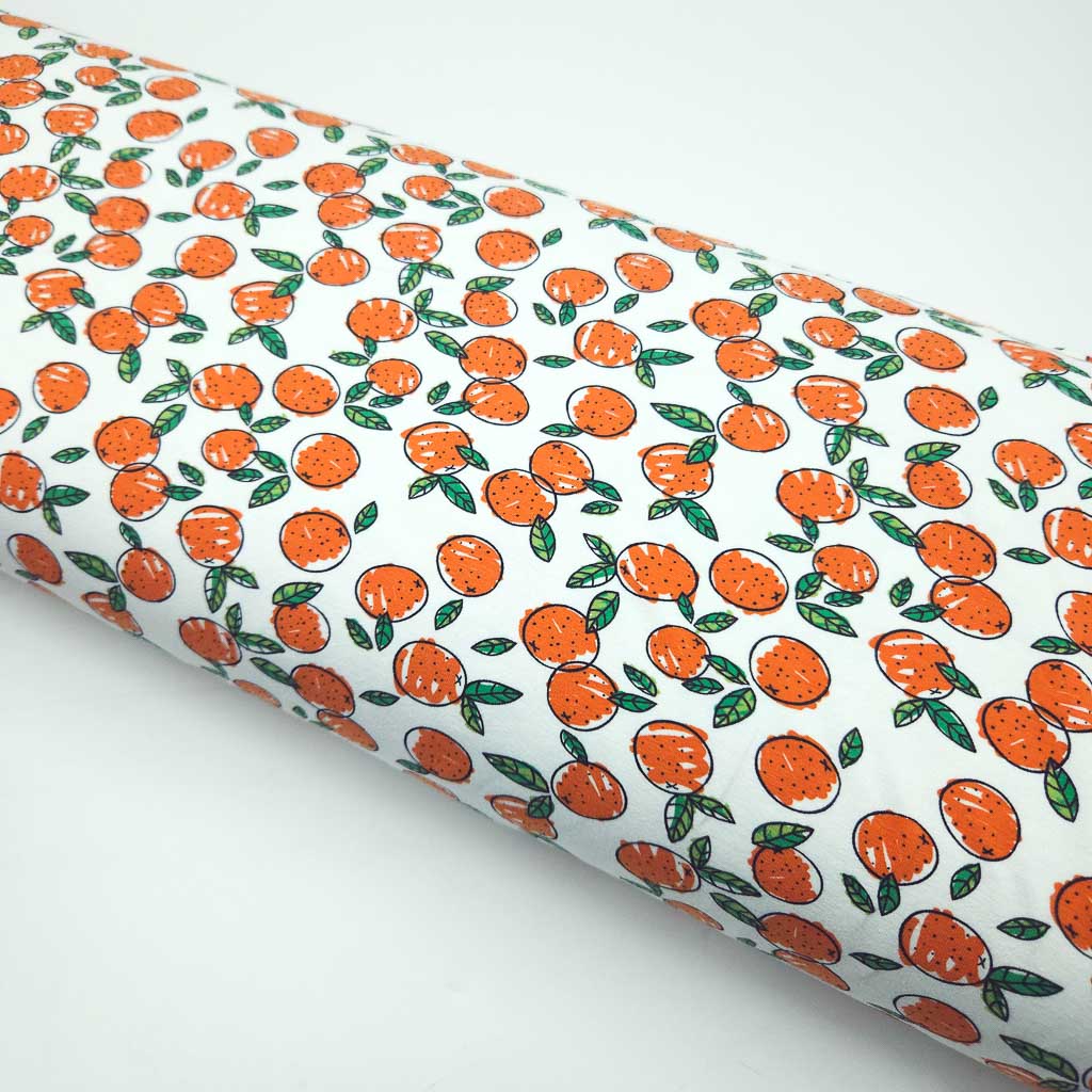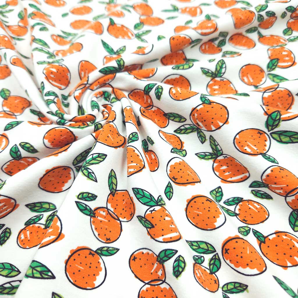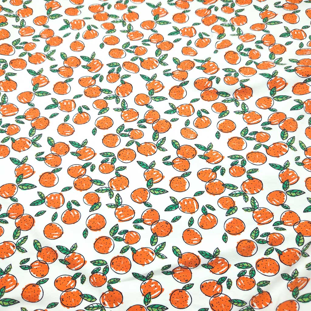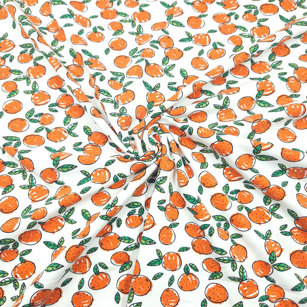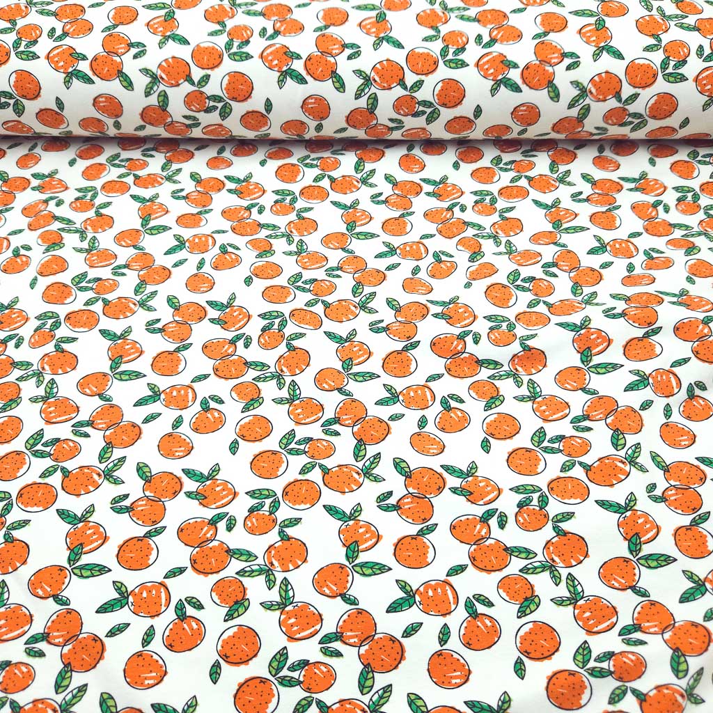 Baumwolljersey Orangen – Weiß – weich, elastisch und hautfreundlich. Der Stoff ist Oeko‑Tex zertifiziert und fühlt sich super angenehm an. Fruchtig frisch! Die kleinen Orangen auf Weiß bringen Sommerfeeling an deine Nähmaschine.