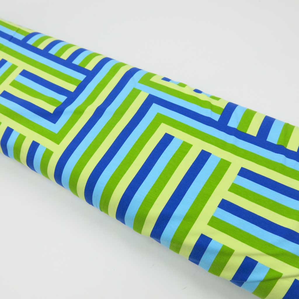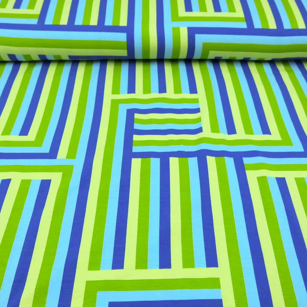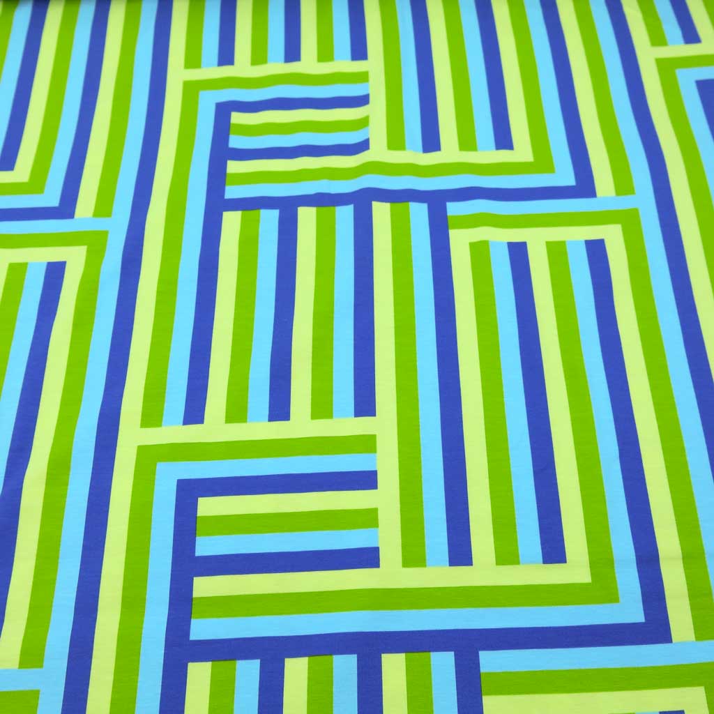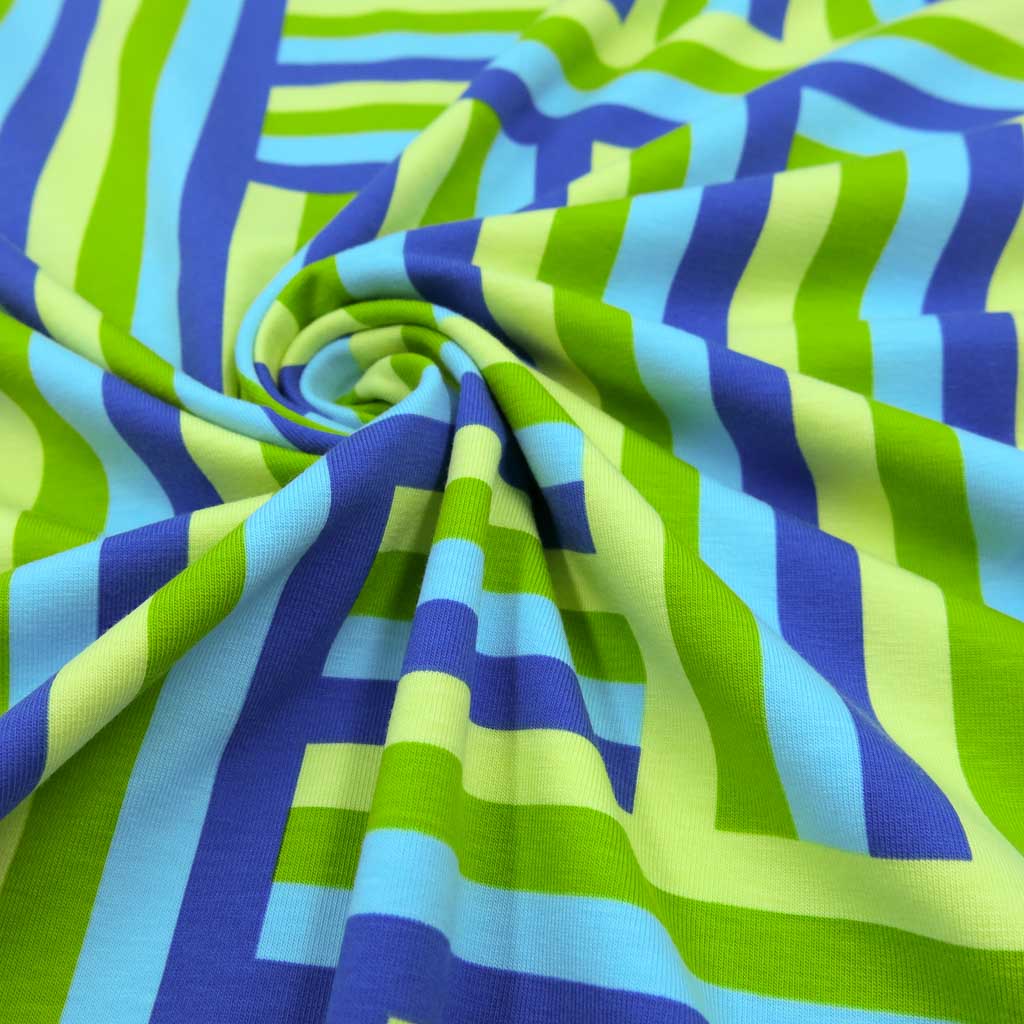 Baumwolljersey Stoff Streifen – Grün & Blau: 💚💙 Dieser Jersey in Grün‑Blau‑Streifen fühlt sich angenehm auf der Haut an und ist Oeko‑Tex Standard 100 zertifiziert. Er bietet dir genau die richtige Mischung aus Weichheit, Formstabilität und Elastizität – ideal für bequeme und langlebige Nähprojekte.