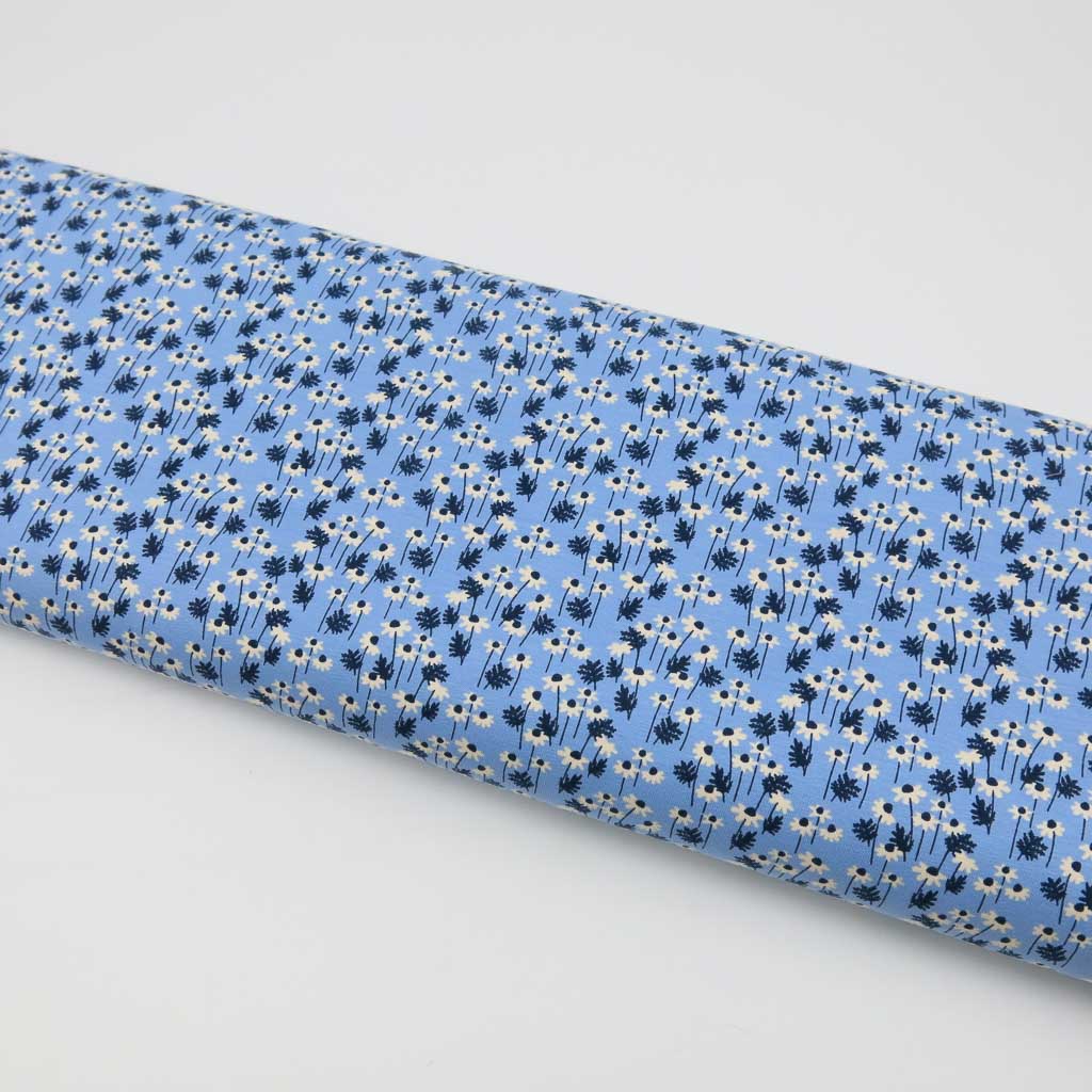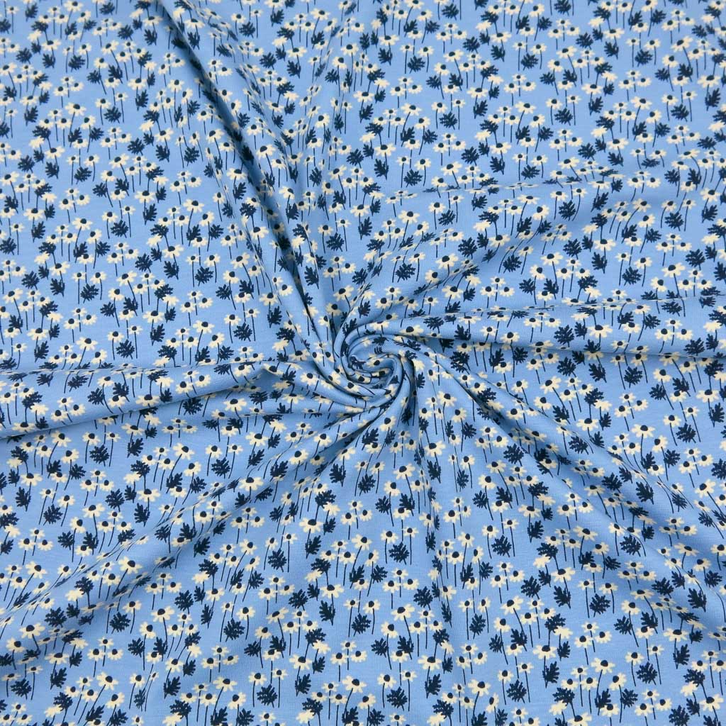 Baumwolljersey Stoff – Daisies Hellblau: Ein weicher, elastischer Jersey in zartem Hellblau mit feinen Blüten. Der Stoff ist Oeko-Tex Standard 100 zertifiziert, liegt angenehm auf der Haut und lässt sich toll verarbeiten – ideal für deine kreativen Projekte. ✂️🧵