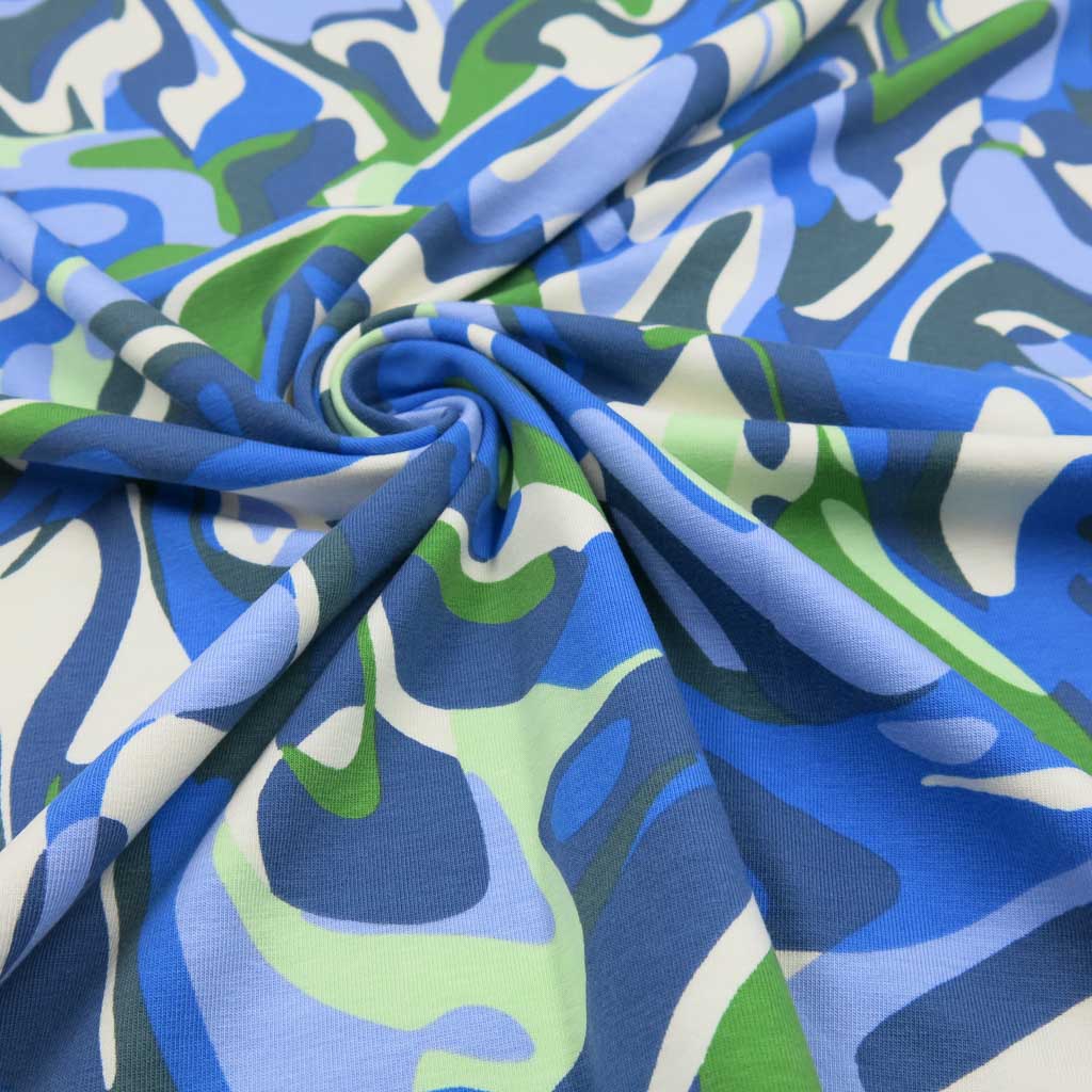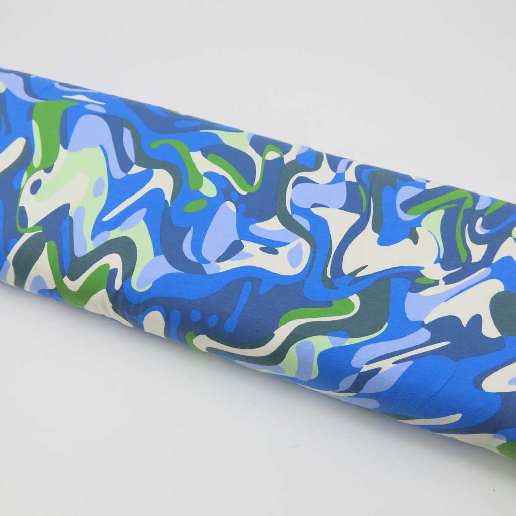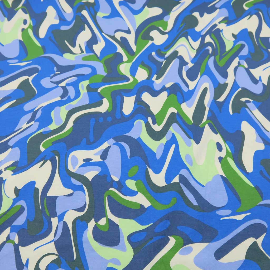 Baumwolljersey Stoff – Camouflage Blau/Grün bringt frische Farbe in deine Garderobe: weich, elastisch und angenehm auf der Haut – perfekt für bequeme Lieblingsstücke im Alltag. Der Stoff ist Oeko‑Tex Standard 100 zertifiziert und überzeugt mit seinem camouflage blau/grün in blau‑ und grüntönen.