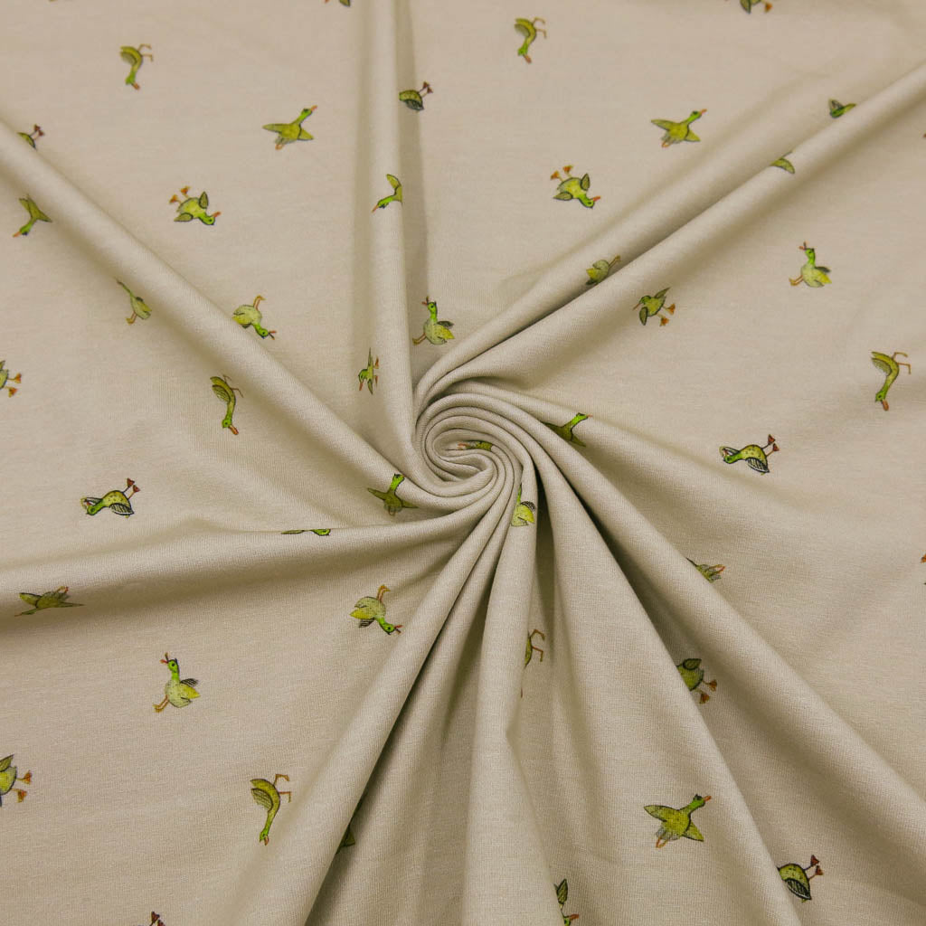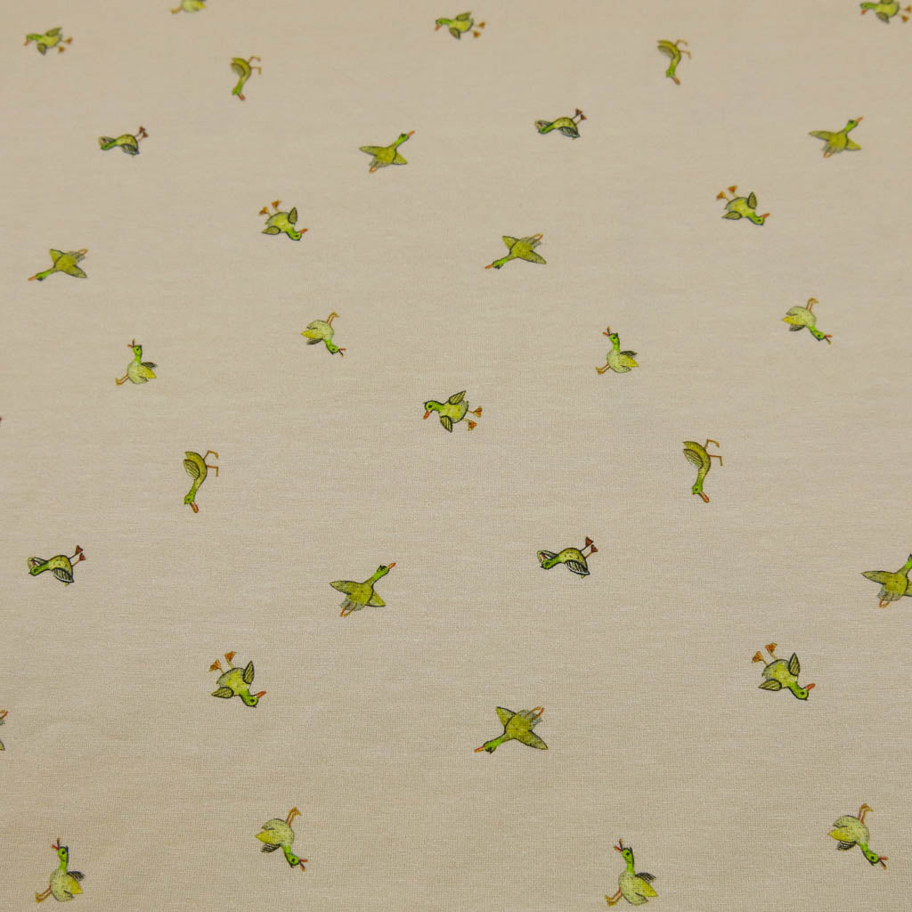 Baumwolljersey Stoff Enten – Beige – Ein kuschelweicher, elastischer Stoff für deine schönsten Nähideen. Die Farben beige mit kleinen Enten treffen auf liebevoller Digitaldruck, weich und dehnbar – perfekt für feminine Looks und bequeme Outfits. Der Stoff ist Oeko‑Tex Standard 100 zertifiziert und liegt angenehm auf der Haut. ✂️🧵