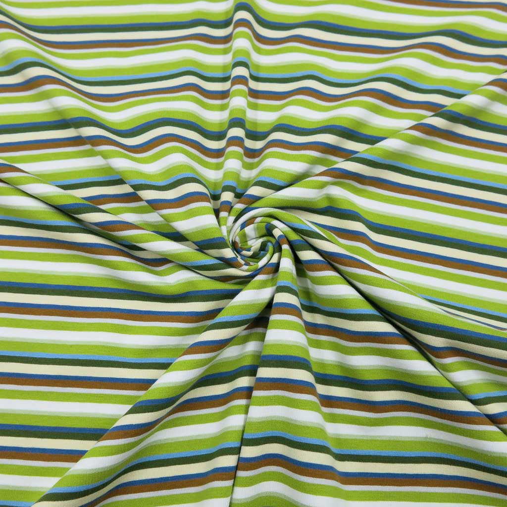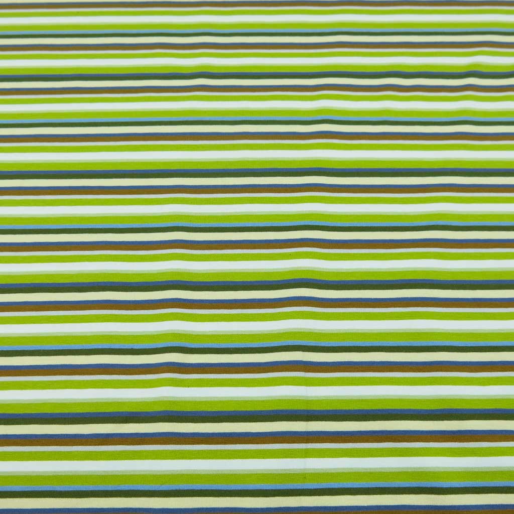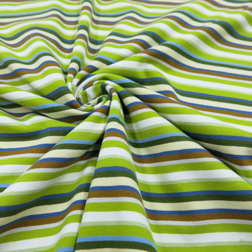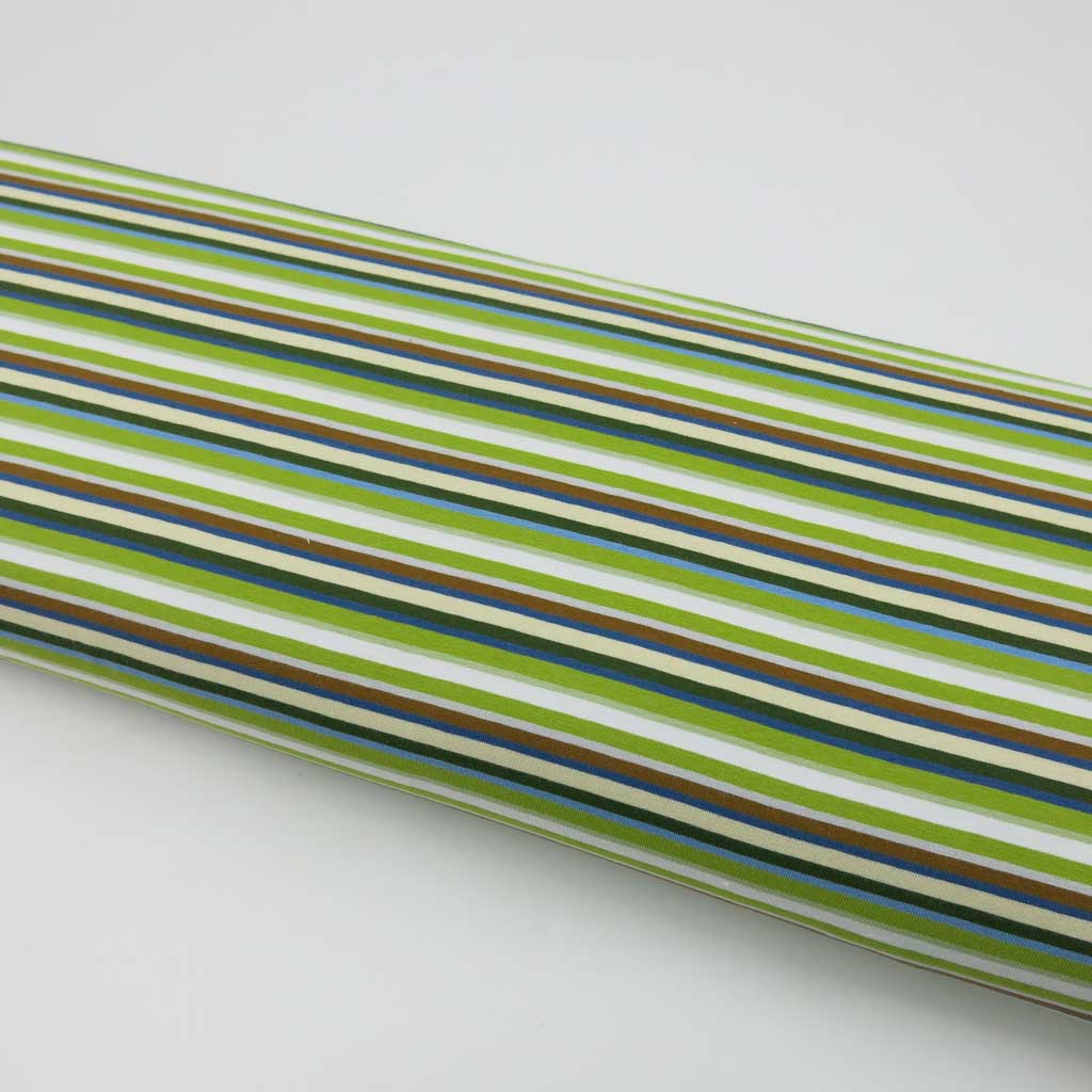 Baumwolljersey – Streifen Grün & Braun bringt frischen Schwung in deine Nähprojekte. Die Farben (grün, braun, weiß, blau – Streifen) wirken modern und lassen sich vielseitig kombinieren. Der Stoff ist angenehm weich, formstabil und nach Oeko‑Tex Standard 100 zertifiziert – ideal für Outfits, in denen du dich wohlfühlst. ✂️🧵
