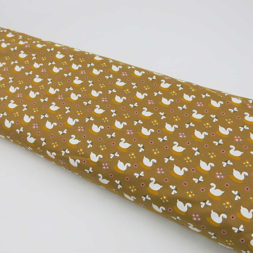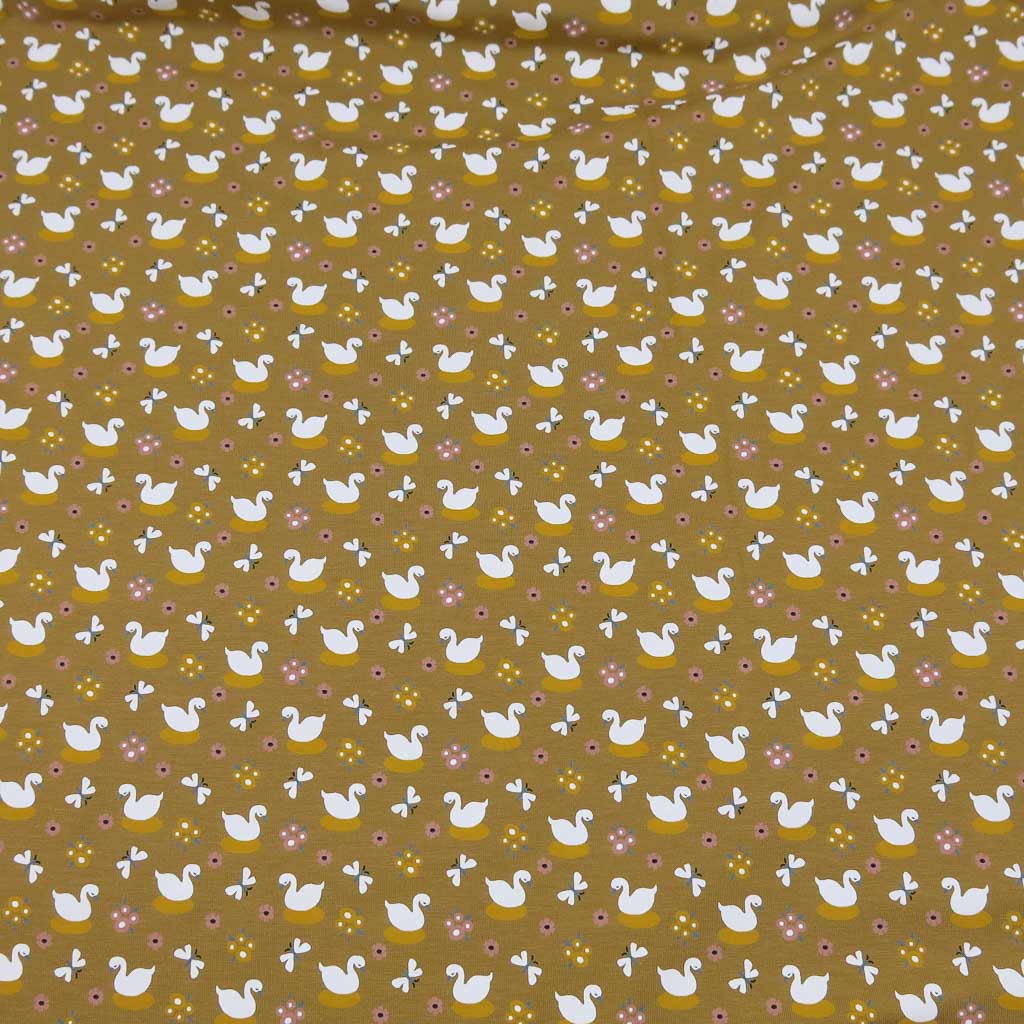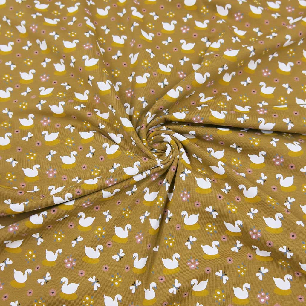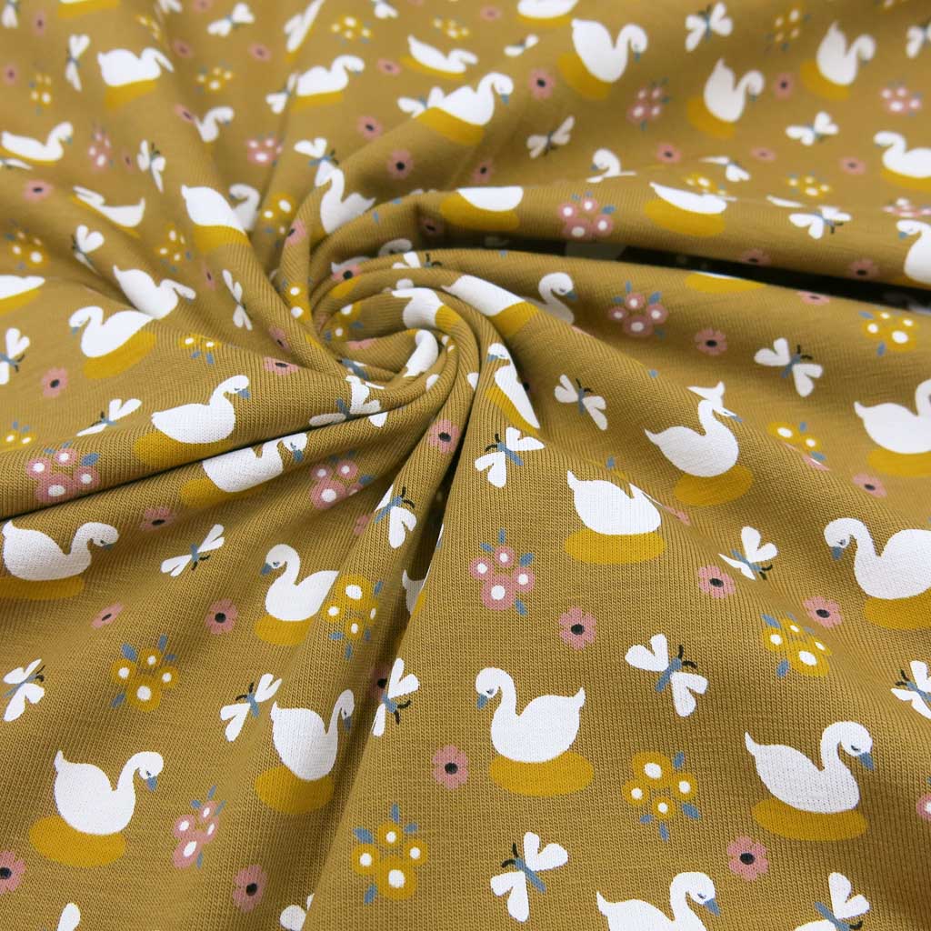Bio Baumwolljersey Stoff – Senf Ätzdruck: 🌿✨ Dieser Jersey in Senf mit verspieltem Print fühlt sich angenehm auf der Haut an und ist Oeko‑Tex Standard 100 zertifiziert. Er bietet dir genau die richtige Mischung aus Weichheit, Formstabilität und Elastizität – ideal für bequeme und langlebige Nähprojekte.