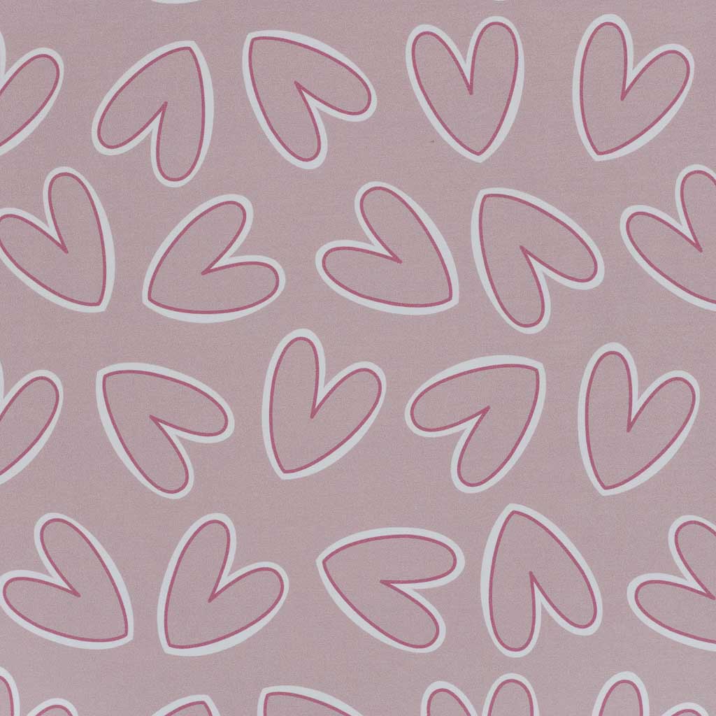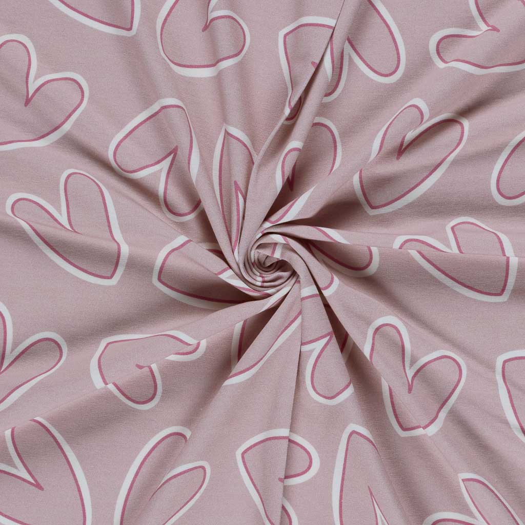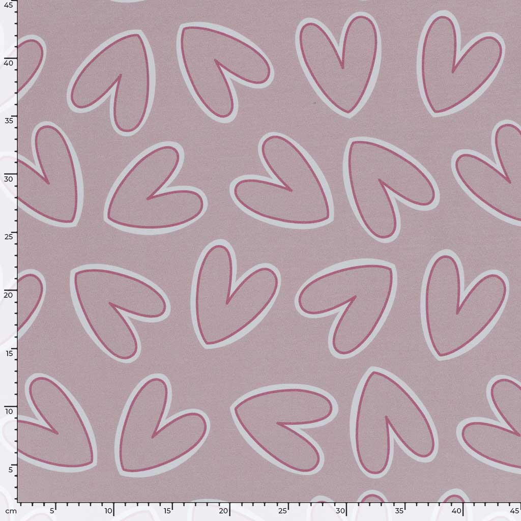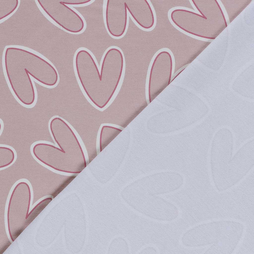 Dieser hochwertige Baumwoll French Terry Stoff mit grosszügigem Herzmotiv überzeugt durch sein ruhiges, modernes Design und eine wunderbar weiche Haptik. Die zarten Herzen in Altrosa und Weiss wirken verspielt, aber nicht kindlich – ideal für zeitlose Nähprojekte für Gross und Klein.