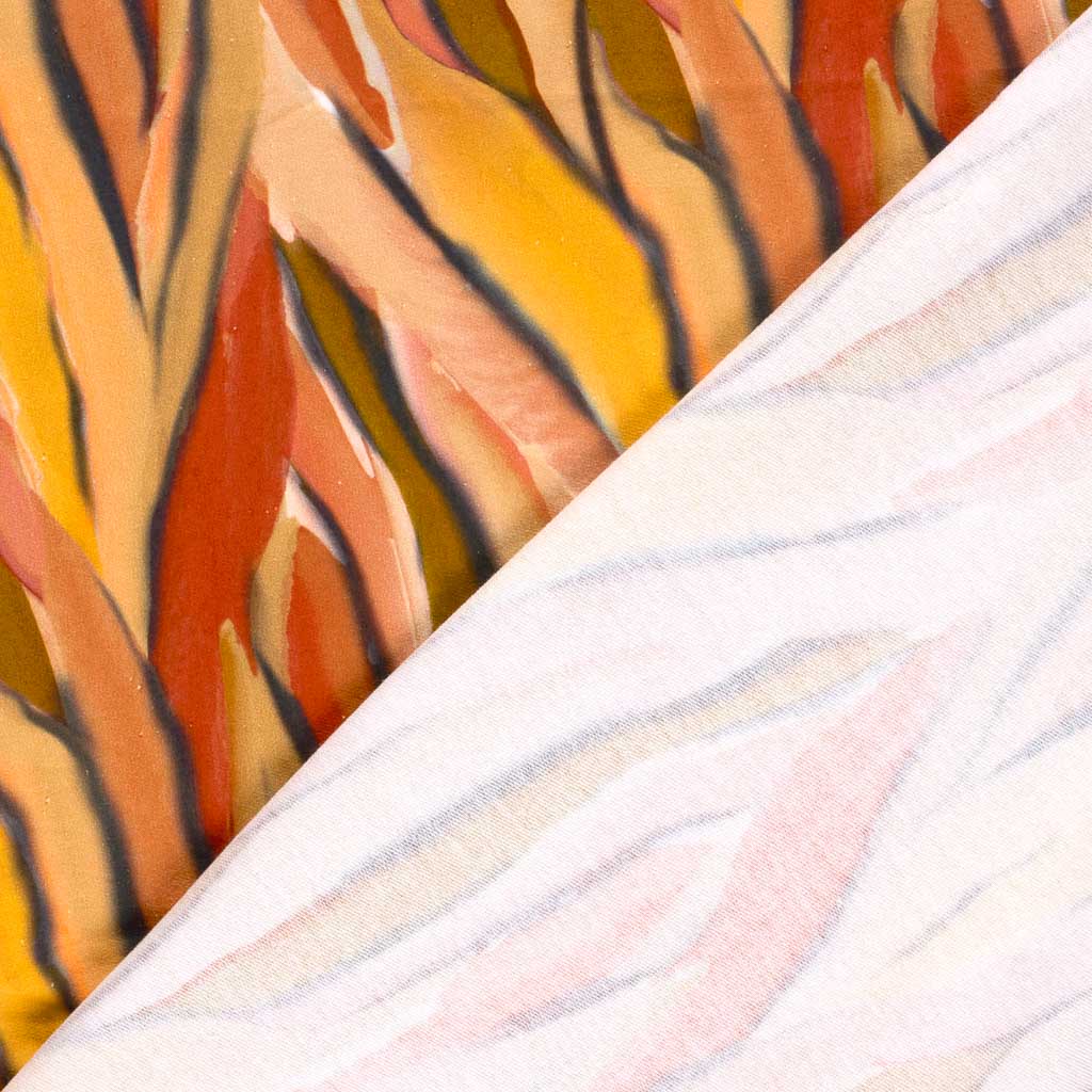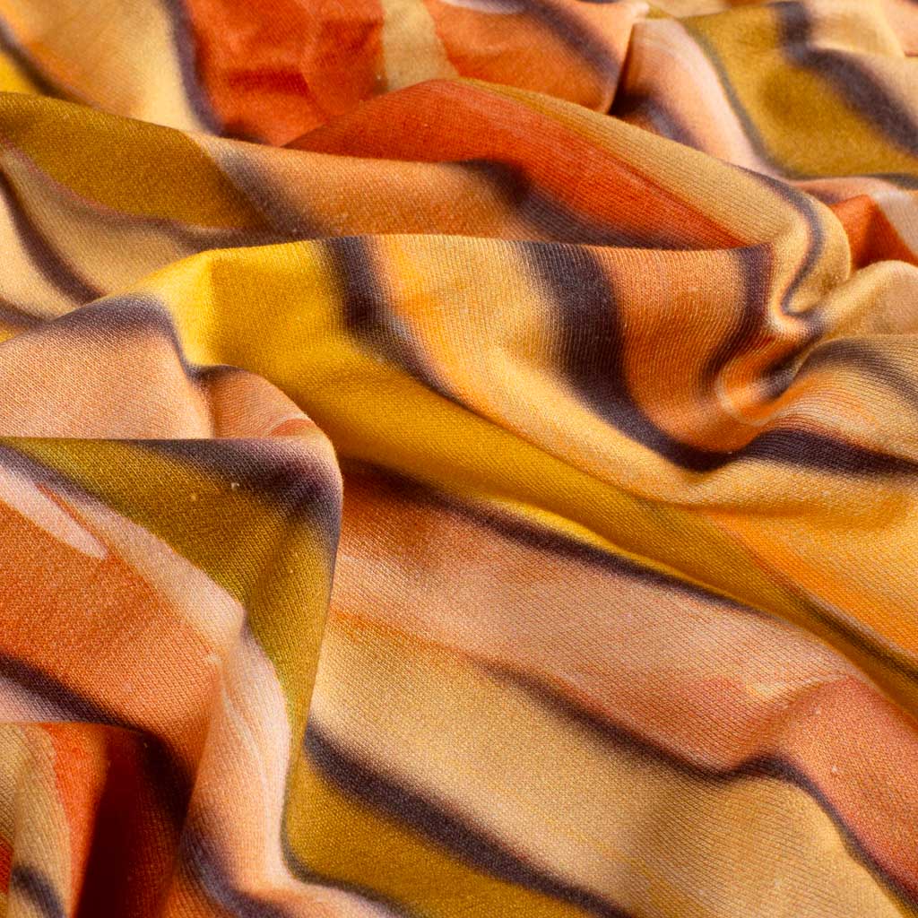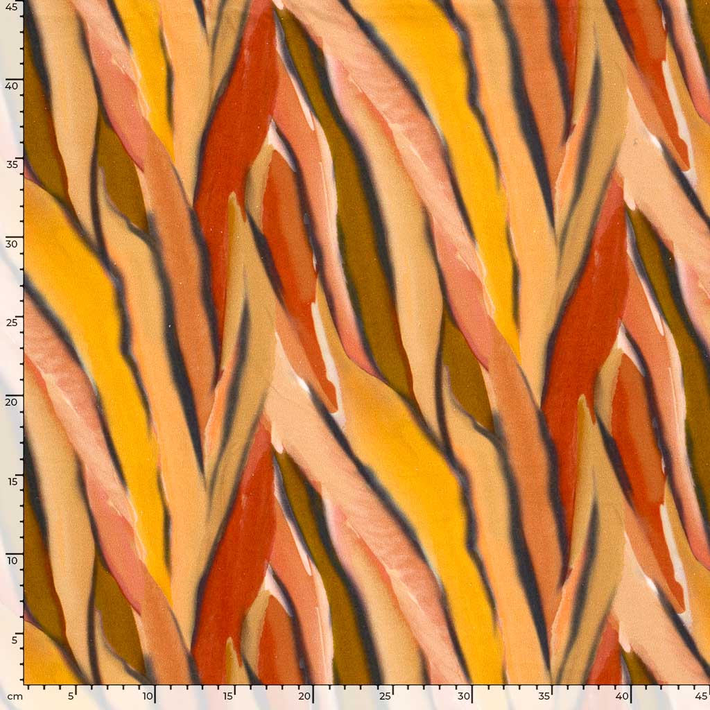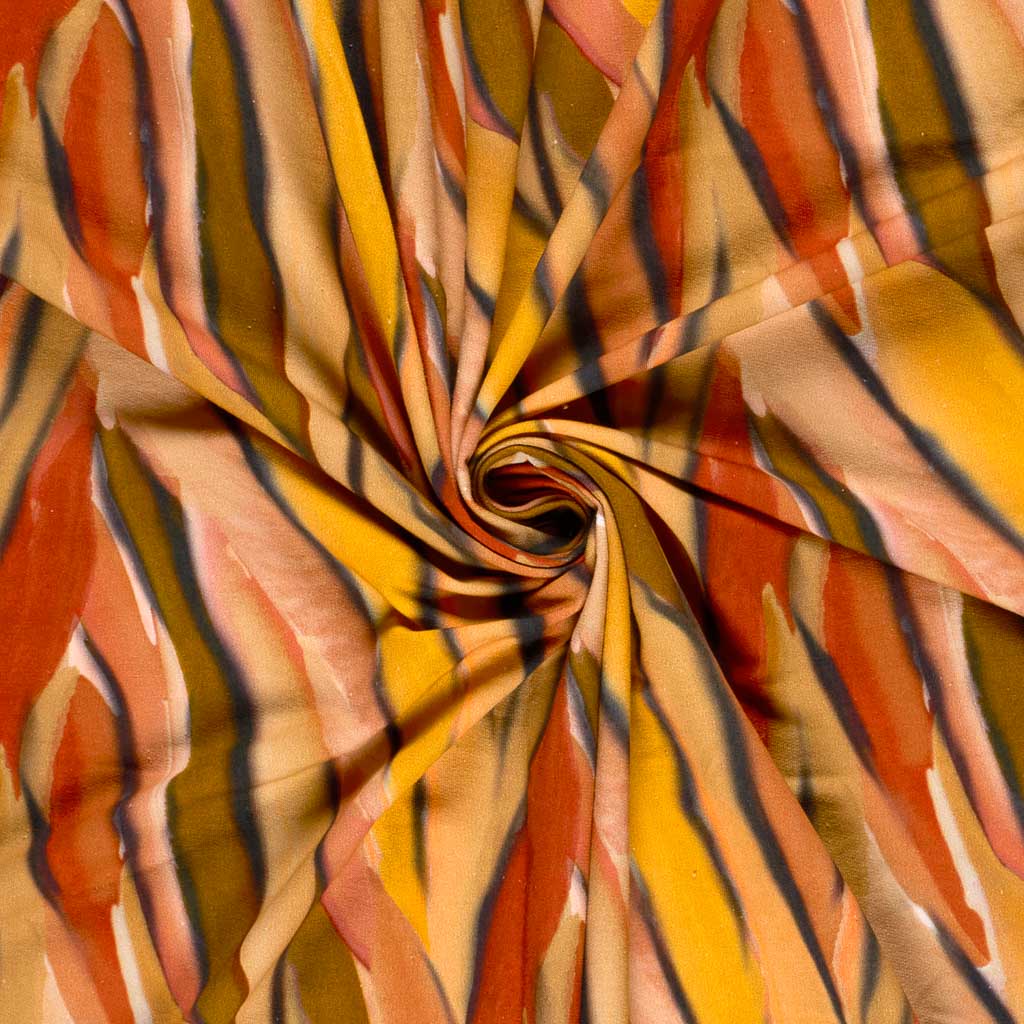 Dieser hochwertige Baumwoll French Terry Stoff mit abstraktem Aquarell-Streifenmotiv überzeugt durch seine warme, harmonische Farbwelt. Fliessende Linien in Senfgelb, Rost, Apricot, Beige und gedecktem Blau erinnern an handgemalte Pinselstriche und verleihen dem Stoff eine moderne, künstlerische Ausstrahlung – ausdrucksstark, aber dennoch ruhig und gut kombinierbar.