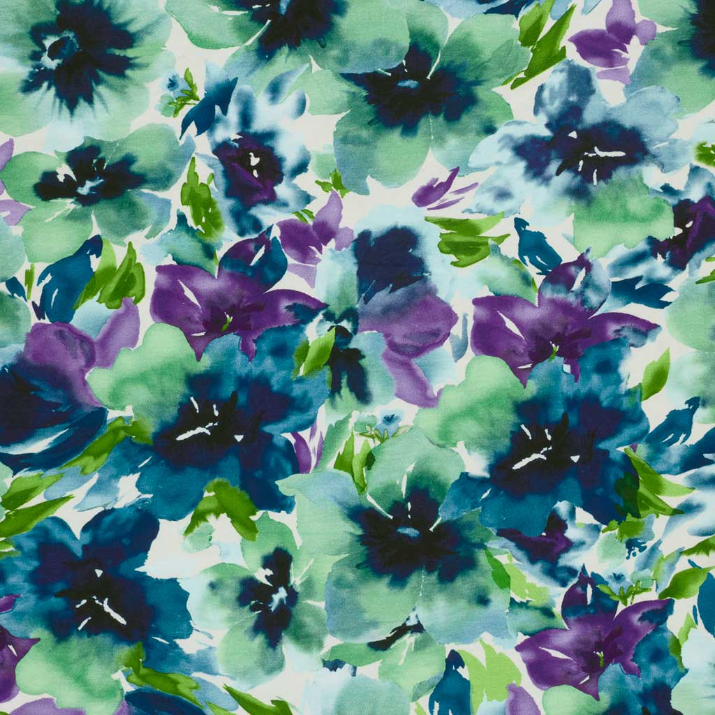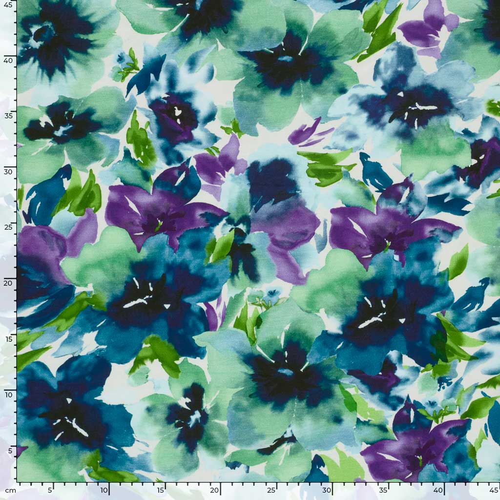 Dieser hochwertige Baumwoll French Terry Stoff mit aquarellartigem Blumenmotiv begeistert durch sein lebendiges, dennoch harmonisches Design und eine angenehm weiche Haptik. Die floralen Formen in Grün-, Blau- und Lilatönen wirken modern und kreativ, ohne aufdringlich zu sein – ideal für stilvolle Nähprojekte für Gross und Klein.