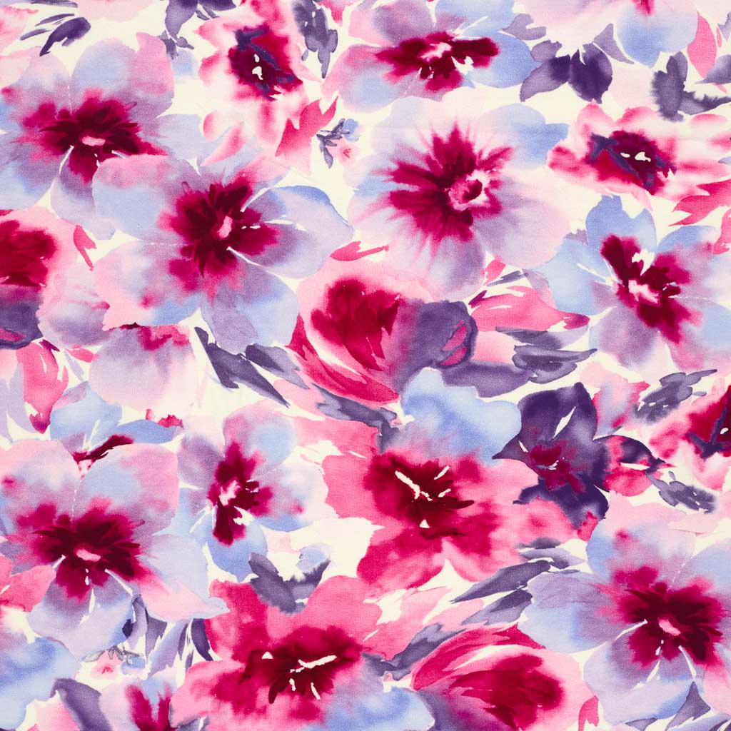 Dieser ausdrucksstarke Baumwoll French Terry Stoff begeistert mit einem grossflächigen Aquarell-Blumenmuster in Pink, Flieder, Beere und soften Naturtönen. Die fliessenden Farbverläufe erinnern an handgemalte Aquarelle und verleihen dem Stoff eine feminine, moderne und zugleich sehr hochwertige Wirkung.