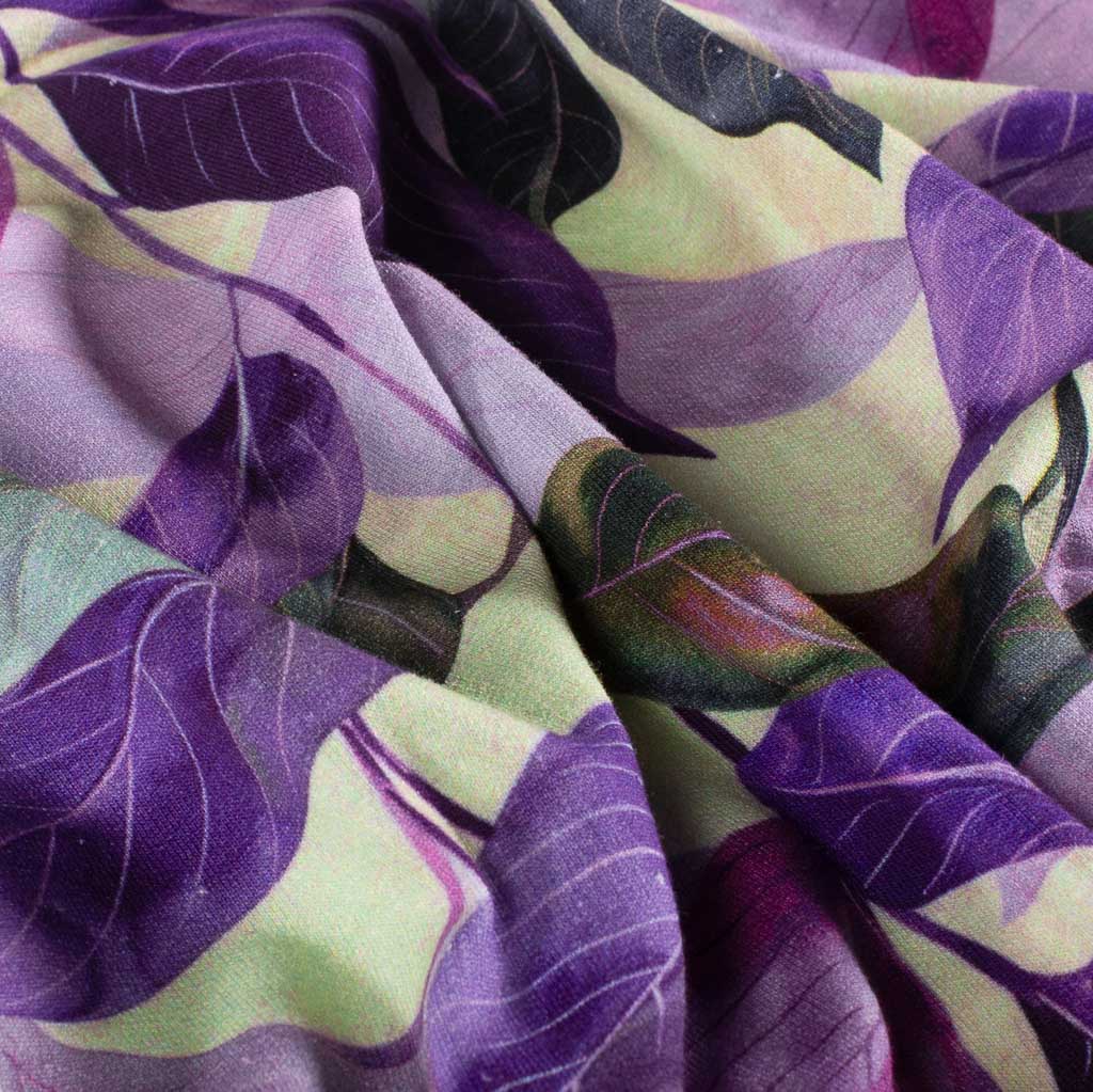 Dieser hochwertige Baumwoll French Terry Stoff mit Aquarell-Blättermotiv begeistert durch sein ausdrucksstarkes, zugleich harmonisches Design. Die grosszügigen Blätter in Lila-, Flieder-, Grün- und Naturtönen wirken wie mit Wasserfarben gemalt und verleihen dem Stoff eine moderne, kreative Eleganz – perfekt für besondere, aber tragbare Nähprojekte.