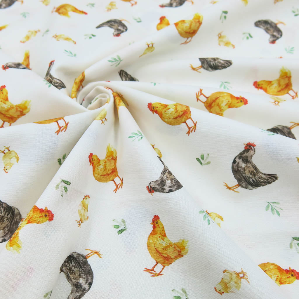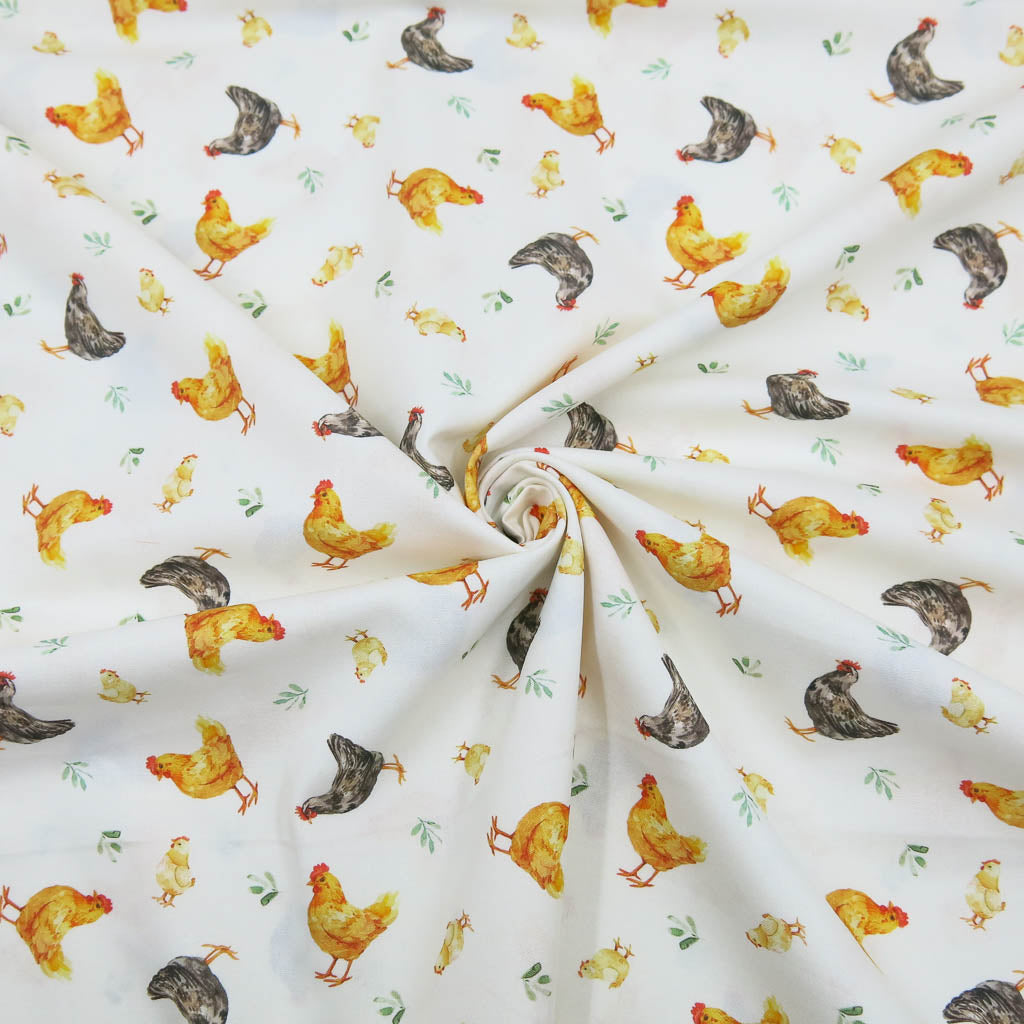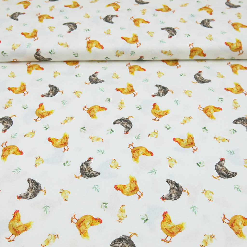Baumwollstoff Popeline – Hühner auf naturweiß