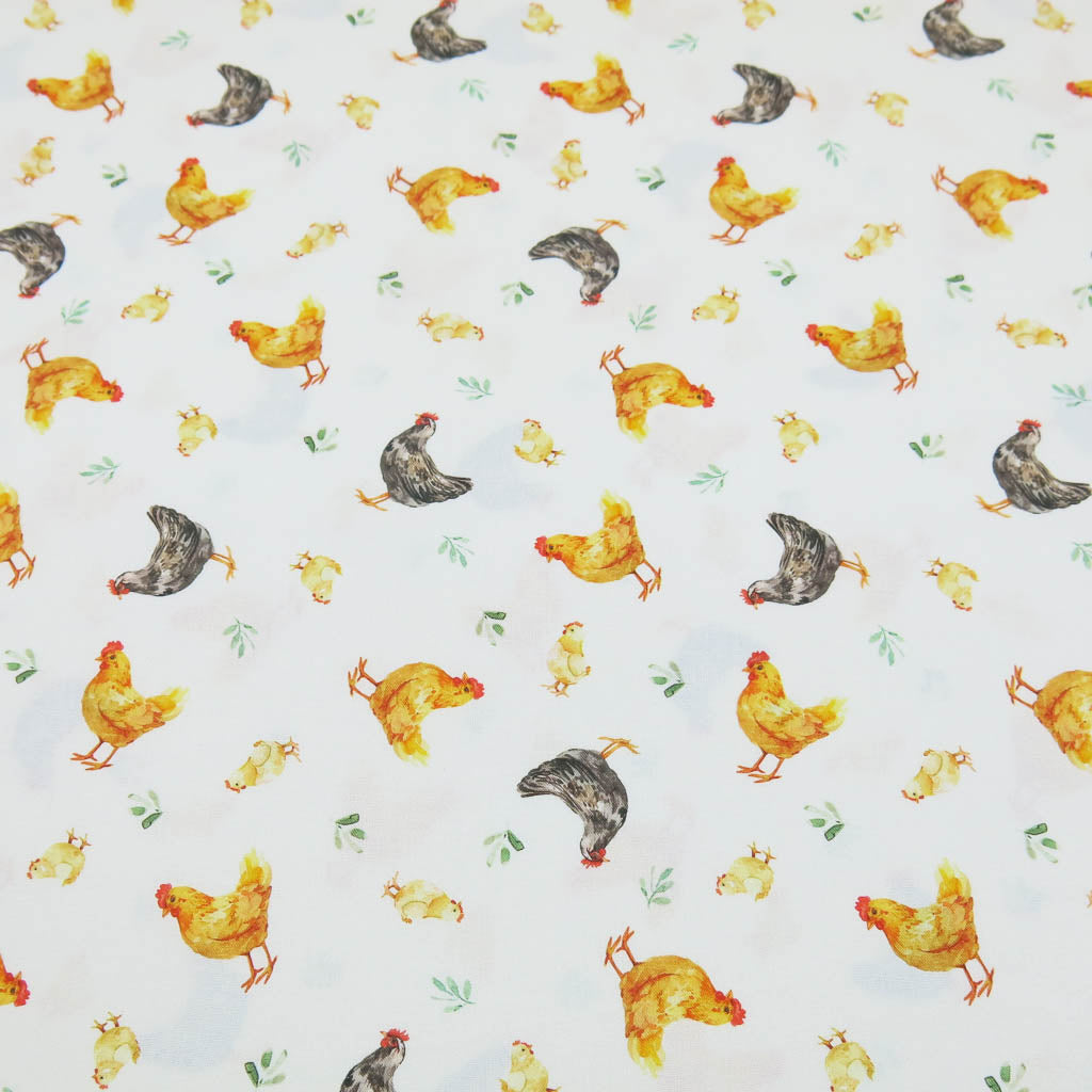 Fröhlicher Landhaus-Charme zum Verlieben! Der Premium-Baumwollstoff mit Hühnern und Küken bringt Wärme in Küche, Garten und Hobbyraum – farbintensiv, weich und formstabil. 🐔🌼 Der Stoff ist Oeko-Tex Standard 100 zertifiziert – gut für dich und für die Haut.
