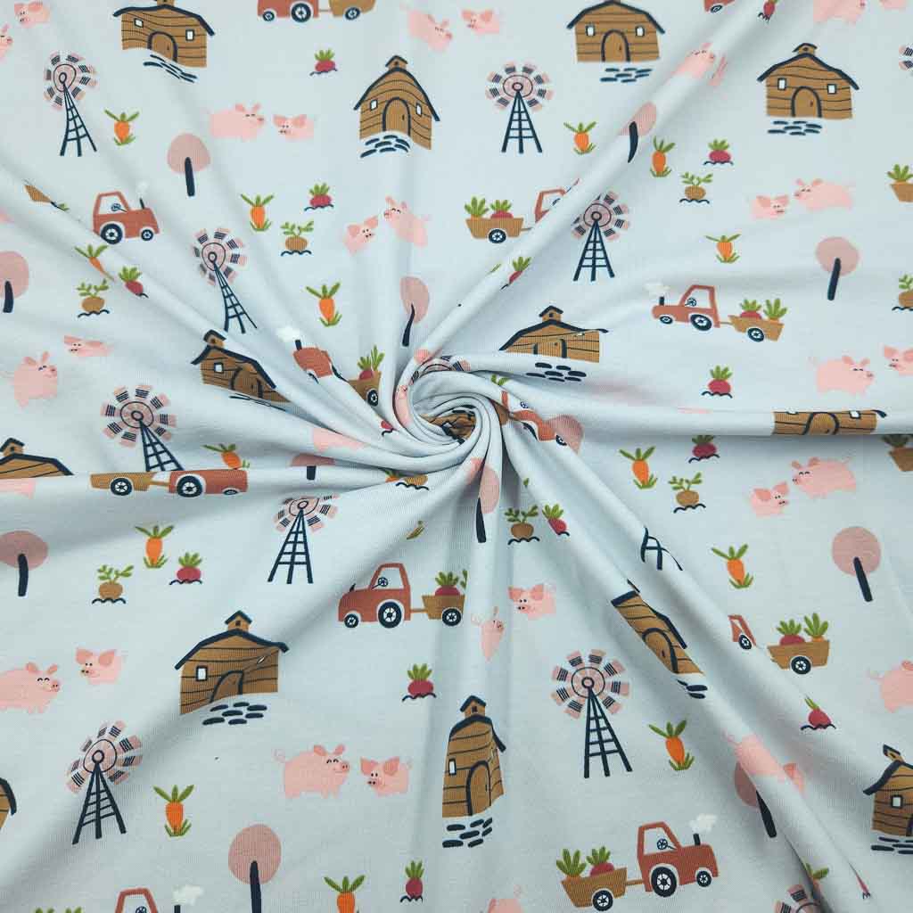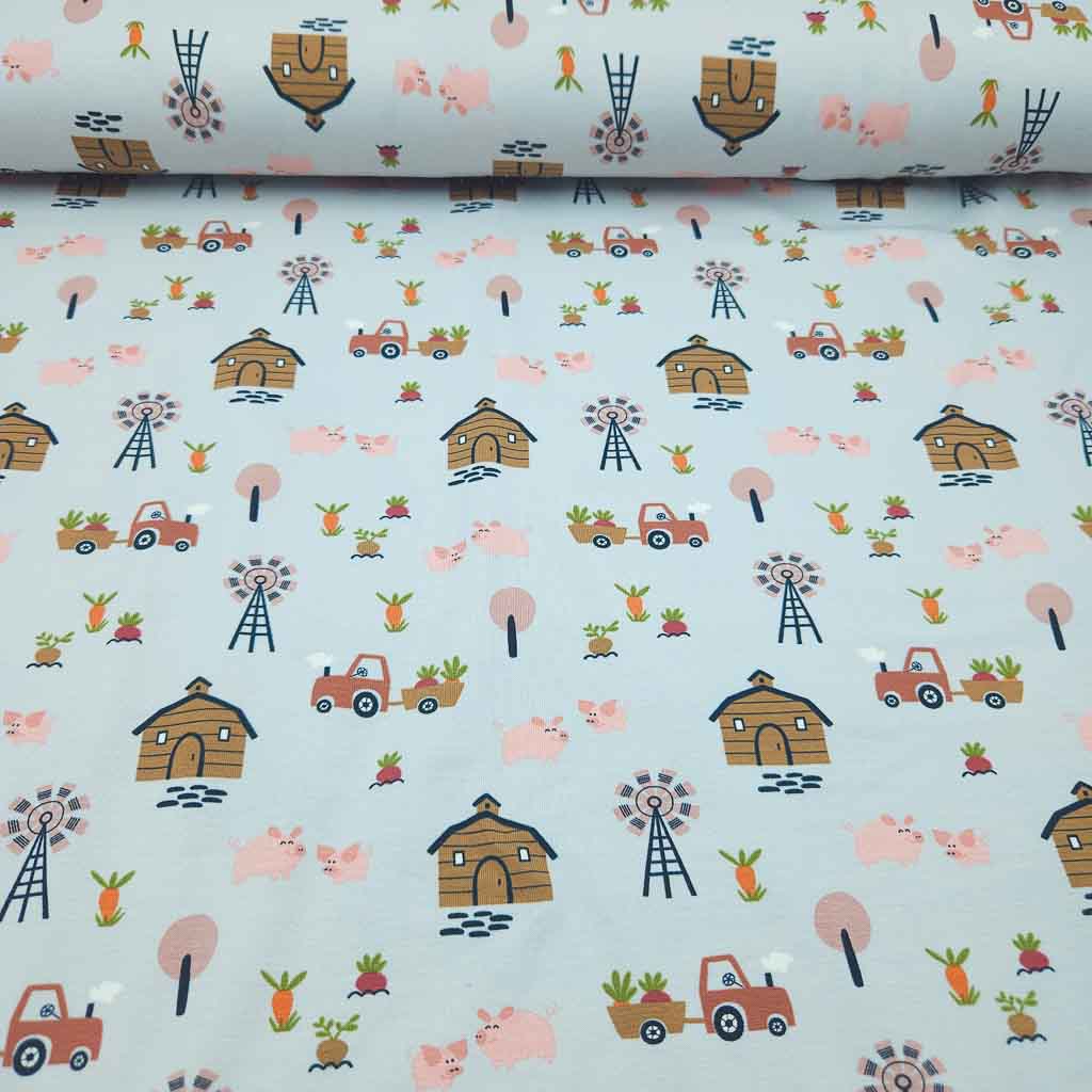 Dieser liebevoll gestaltete Jersey Stoff mit Bauernhof-Motiv bringt ländliche Idylle auf den Nähtisch. Kleine Schweinchen, Traktoren, Scheunen, Windräder und Gemüse verteilen sich harmonisch auf einem sanften hellgrauen Hintergrund. Das Design wirkt ruhig, verspielt und zeitlos – perfekt für Kinderkleidung und gemütliche Alltagsstücke.