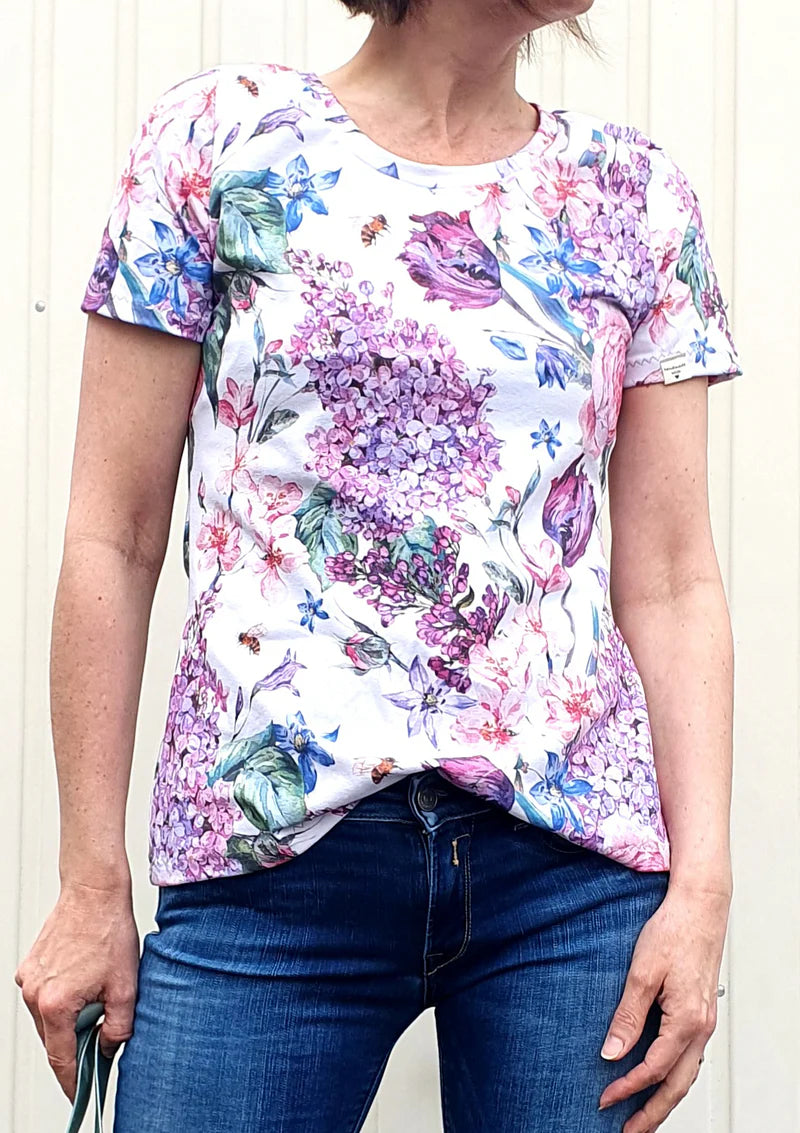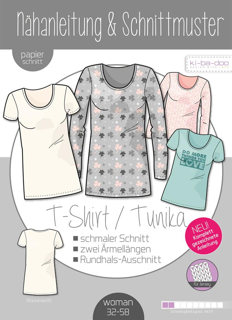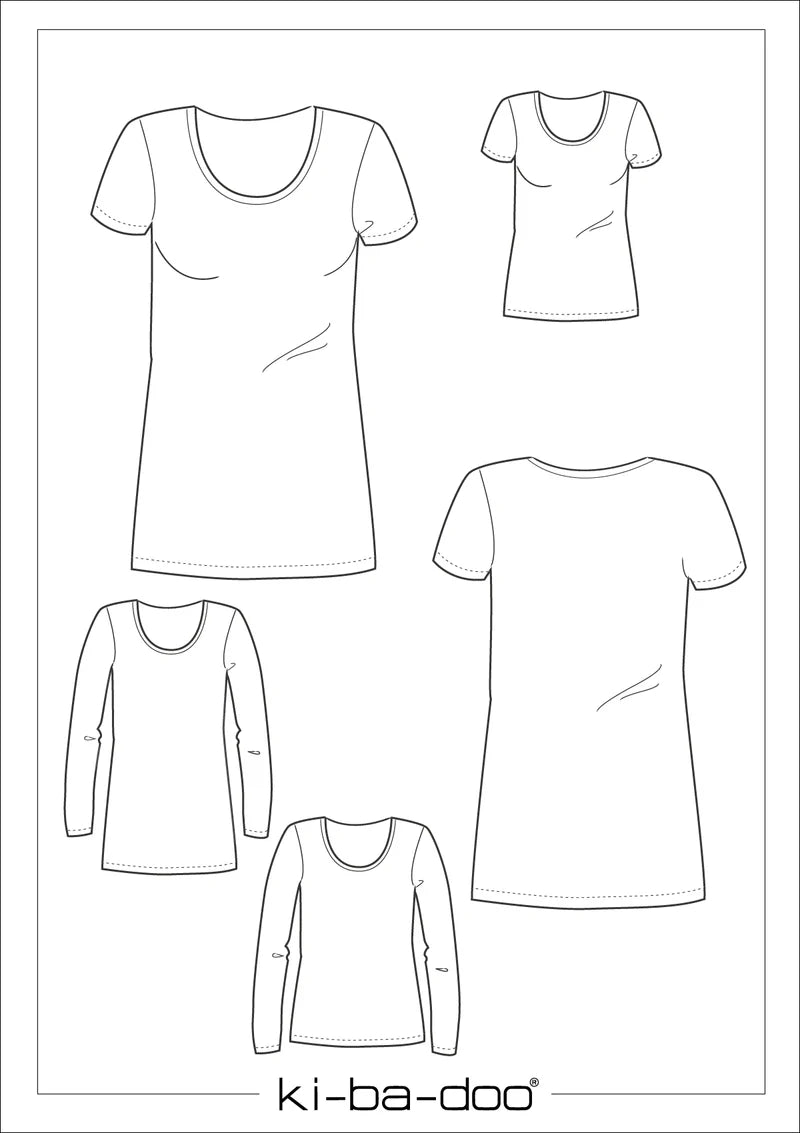 Dieses Shirt ist schön schlank geschnitten. Sie kann als Kurzarm- oder Langarm-Variante genäht werden. Die Länge kann selber bestimmt werden. So entsteht auch schnell ein einfaches Basic-Shirt. Für jede Jahreszeit der perfekte Begleiter. Ob solo oder zur schmalen Hose oder Leggings!