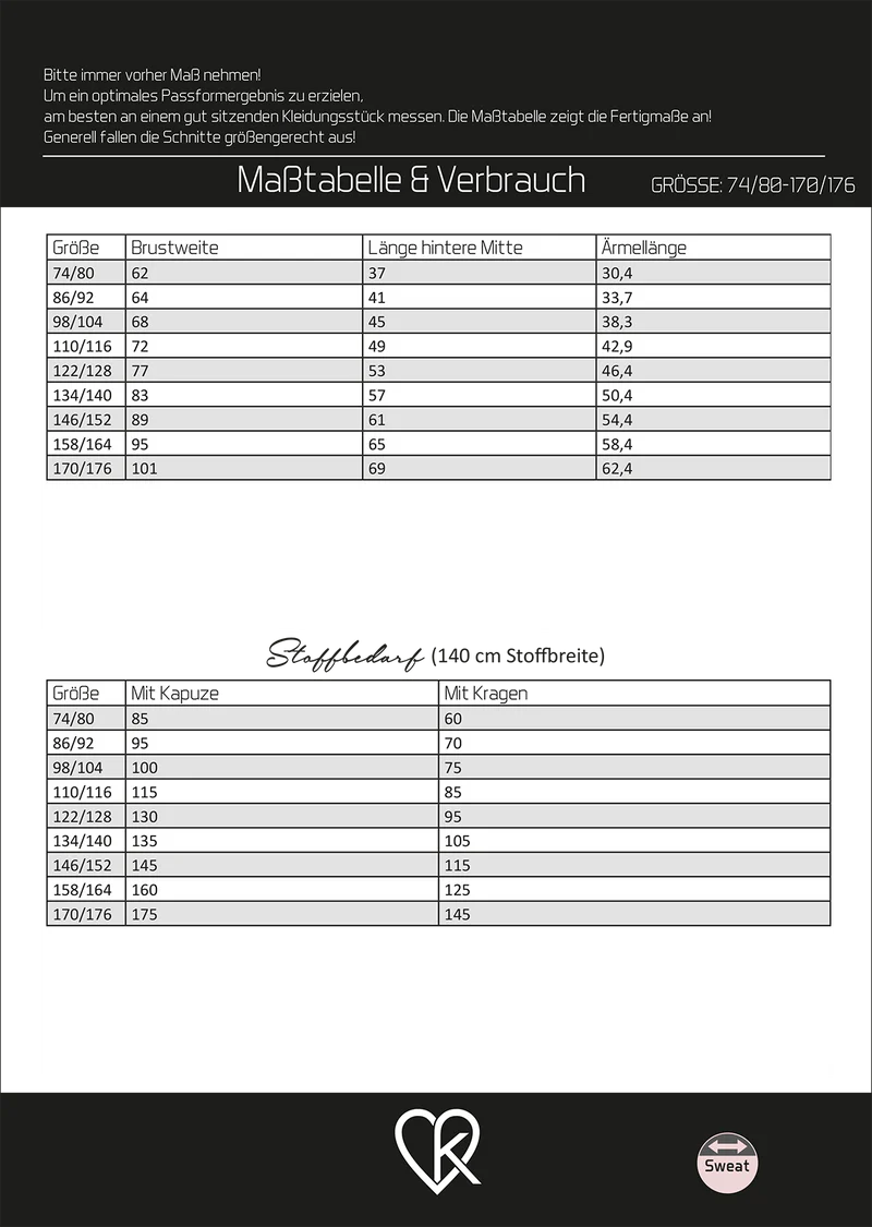 Die abgerundete Bauchtasche und die großen Armpatches vervollständigen die coole Hoodie-Optik. Er hat eine angenehm legere Weite und ist ebenso für Mädchen/Damen nähbar.