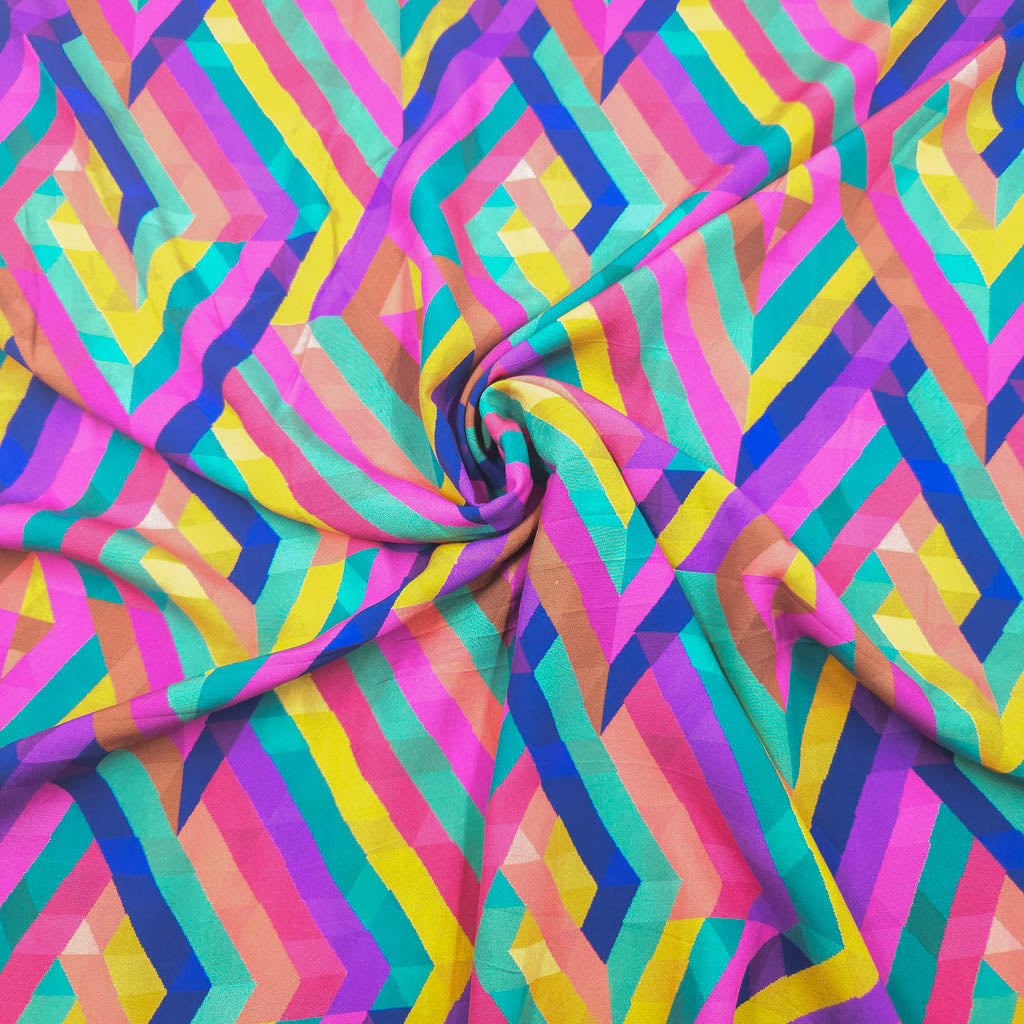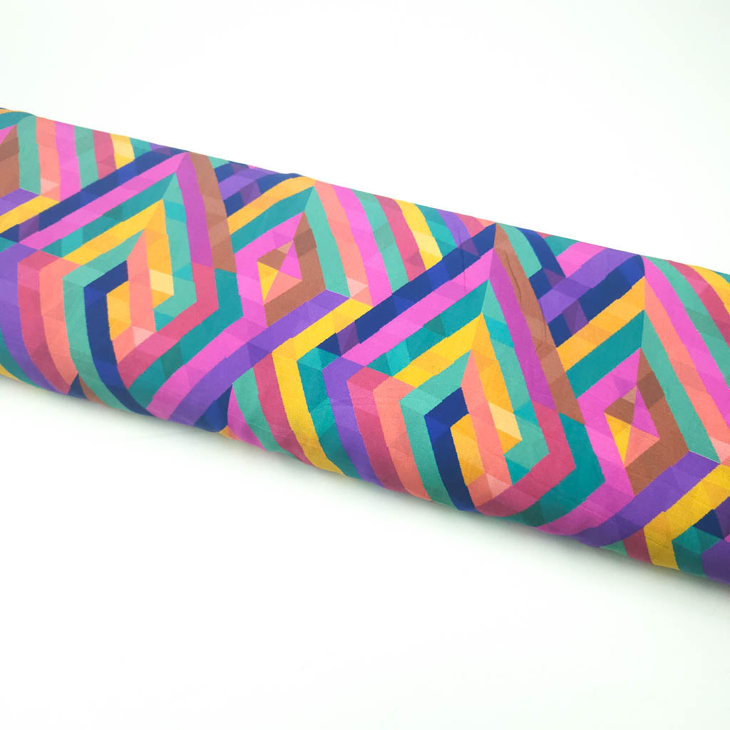 Leicht, fließend und farbenfroh: Diese Viskose mit geometrischem Muster bringt Bewegung in deine Garderobe. Oeko‑Tex Standard 100 sorgt für ein gutes Gefühl auf der Haut. ✨🧵