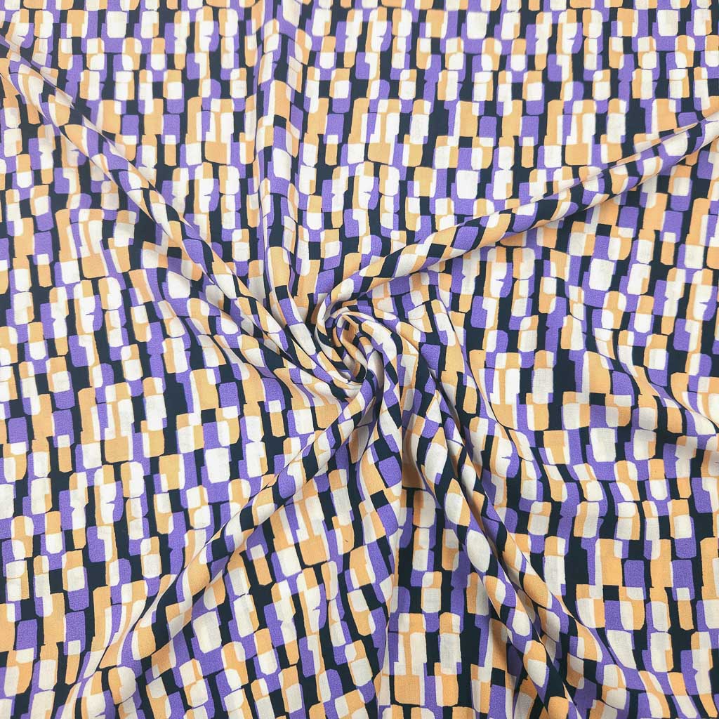 Moderner Viskose Stoff mit grafischem Kachelmuster in Lila und Okker – luftig, geschmeidig und super bequem. 🌟🧵
