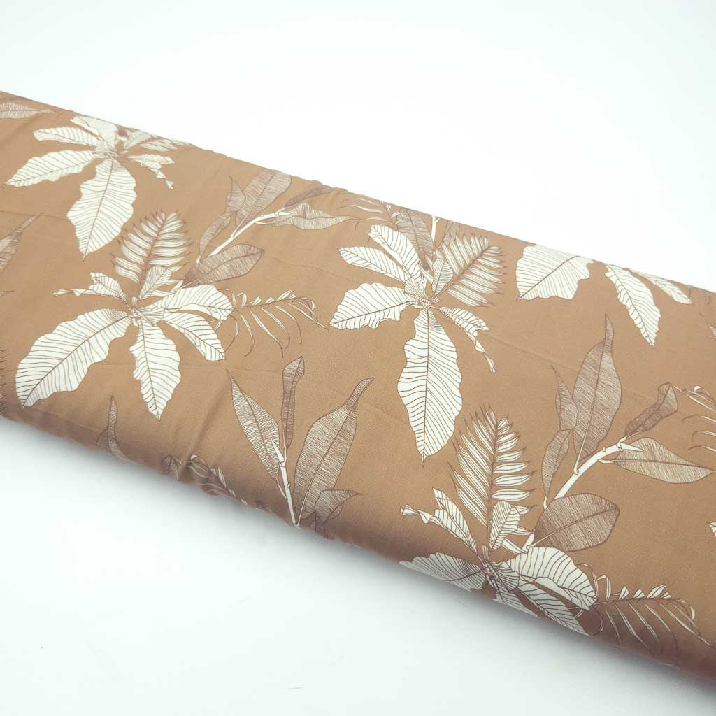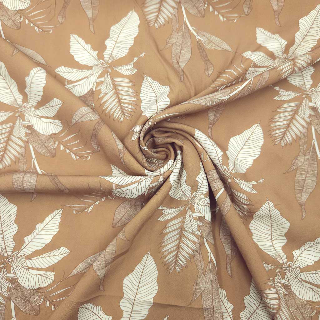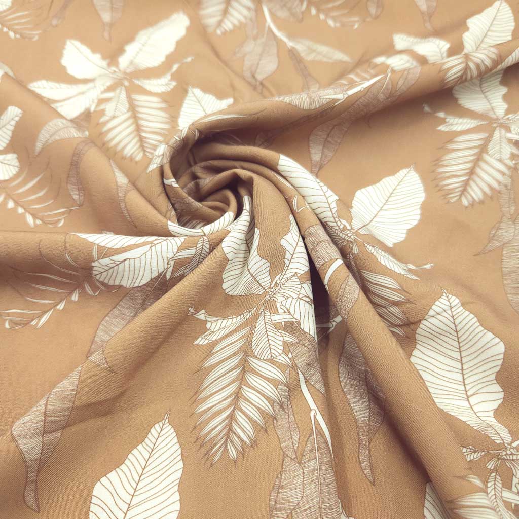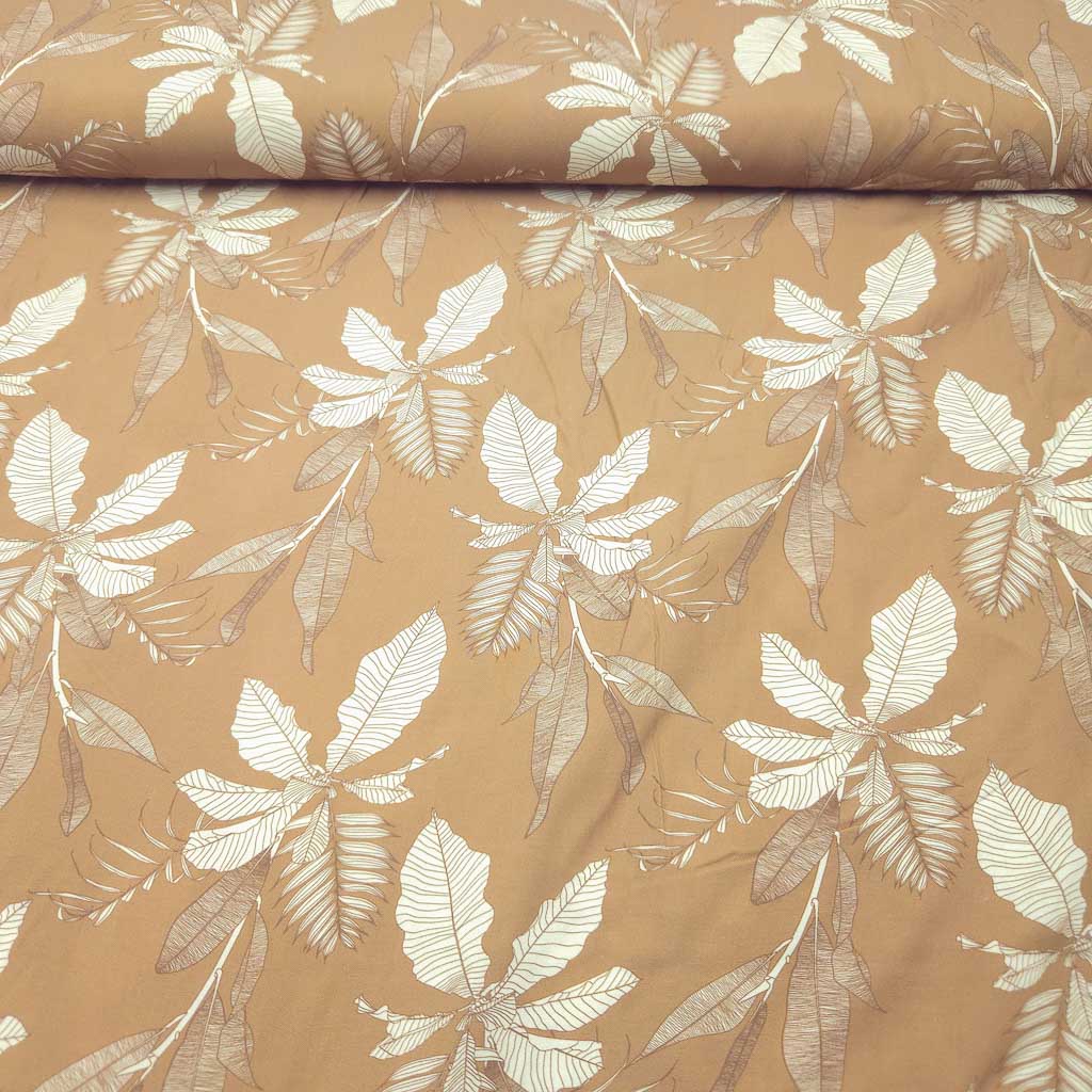 Eleganter Viskose Stoff in warmem Sandton mit feinem Blattdesign – fließend, atmungsaktiv und wunderbar figurschmeichelnd. 🌿✨