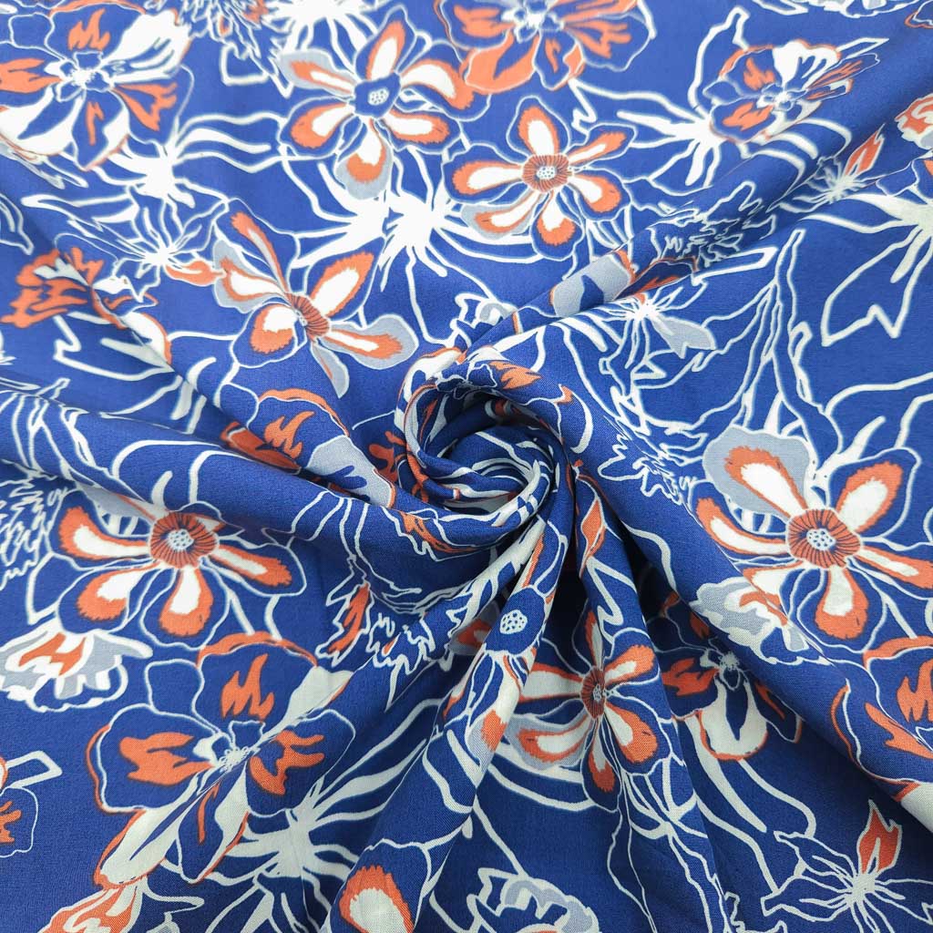 Unser Viskose Stoff – Blumen in Rost & Hellgrau auf Jeansblau besticht durch sein stilvolles, florales Design. Die zarten Blüten in Rost, Weiß und Hellgrau heben sich wunderschön vom tiefen Jeansblau ab und machen diesen Stoff zu einem echten Blickfang.
