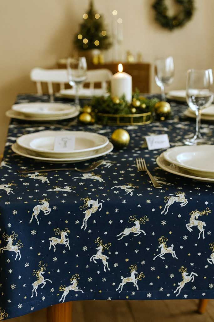 Baumwollstoff - Weihnachtshirsch auf Dunkelblau mit Gold