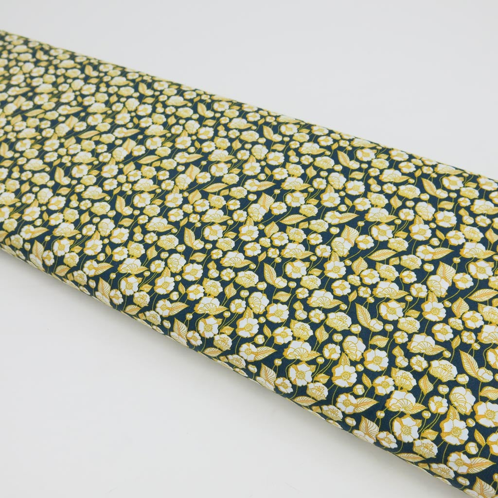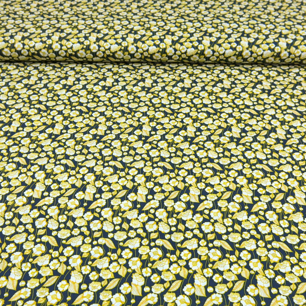 Baumwollstoff Popeline - Gelbe Blumen auf Petrol